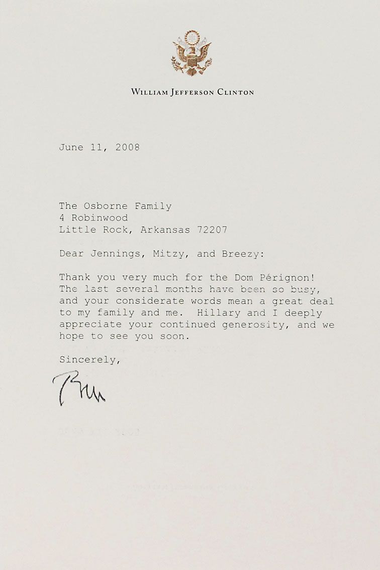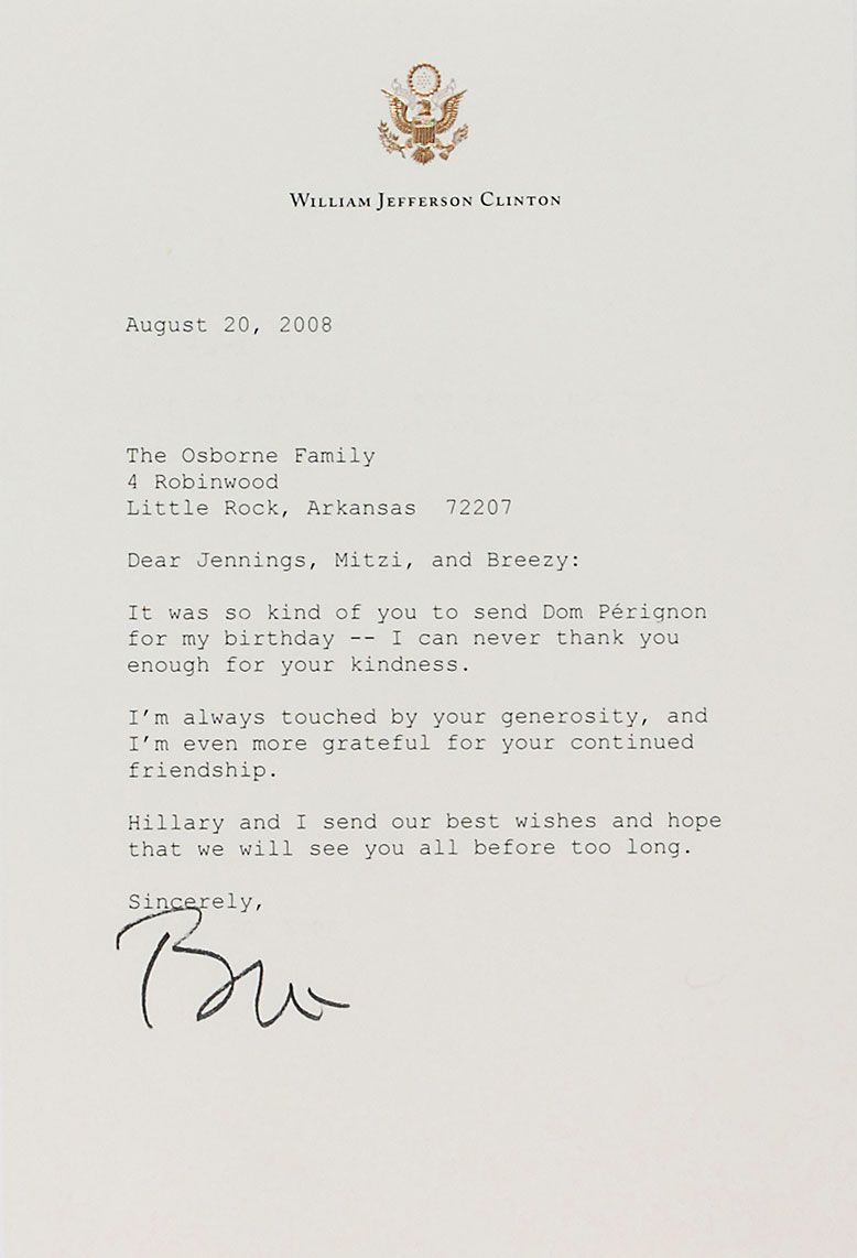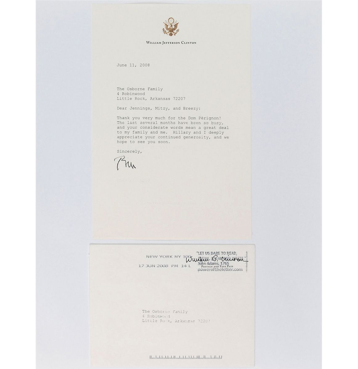 Two TLSs, both signed Bill, each one page, 6.25 x 9, personal letterhead, dated June and August 2008. Both letters are to the Osbourne Family sending thanks for gifts. One letter reads, in full: “Thank you very much for the Dom Perignon! The last several months have been so busy, and your considerate words mean a great deal to my family and me. Hillary and I deeply appreciate your continued generosity, and we hope to see you soon.” Both letters are accompanied by their original mailing envelopes and are affixed to either side of a 11.75 x 14.5 scrapbook page. In fine condition.