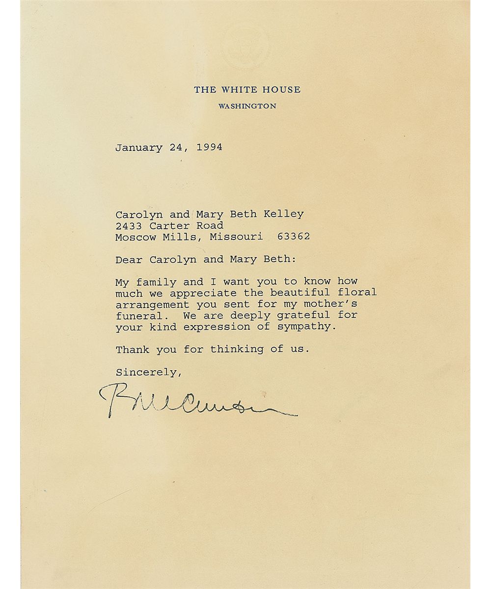 TLS as president, one page, 6.75 x 9, White House letterhead, January 24, 1994. Letter of thanks for flowers. In full: “My family and I want you to know how much we appreciate the beautiful floral arrangement you sent for my mother’s funeral. We are deeply grateful for your kind expression of sympathy. Thank you for thinking of us.” Scattered toning, otherwise fine condition.