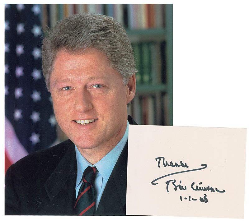 Bold felt tip signature, “Thanks, Bill Clinton, 1-1-08,” on an off-white 5 x 3.75 sheet. In very fine condition. Accompanied by four snapshots of Clinton at the campaign event in Iowa where the consignor obtained the signature, as well as an unsigned portrait.
