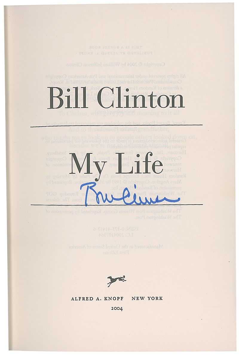 Signed book: My Life. First edition. NY: Alfred A. Knopf, 2004. Hardcover with dust jacket, 6.5 x 9.5, 957 pages. Signed on the title page in blue felt tip. In fine condition, with scattered surface marks and adhesive remnants to dust jacket.