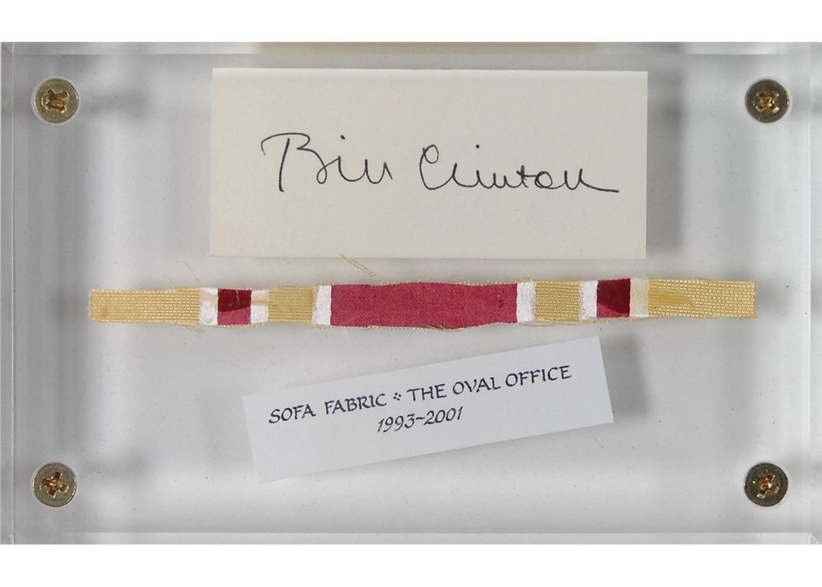 Ink signature, “Bill Clinton,” on a 3 x 1.25 off-white card; and a 4.5 x .5 strip of fabric from a White House sofa used in the Oval Office from 1993–2000. Both are presented in a 5.75 x 3.5 Lucite holder. In fine condition. Accompanied by a photocopied 2004 letter from official White House framer Frank Posey stating that this is one of about 100 “extra” presentations made for Clinton to give as Christmas gifts in 2000.