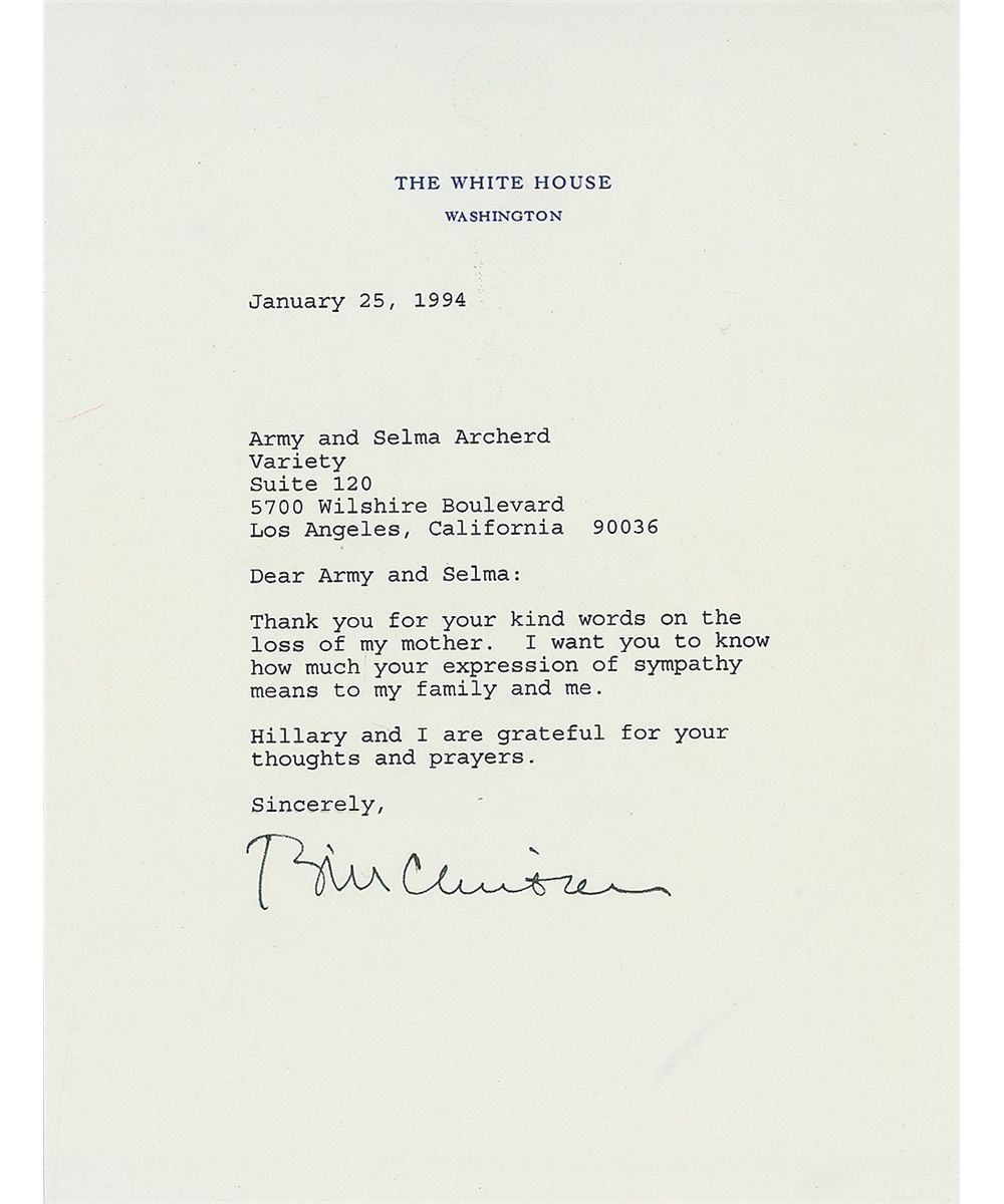 TLS as president, one page, 6.75 x 9, White House letterhead, January 25, 1994. Letter to Army and Selma Archerd. In part: “Thank you for your kind words on the loss of my mother. I want you to know how much your expression of sympathy means to my family and me.” In fine condition, with a horizontal crease near top edge. Accompanied by a letter of authenticity from James Spence.