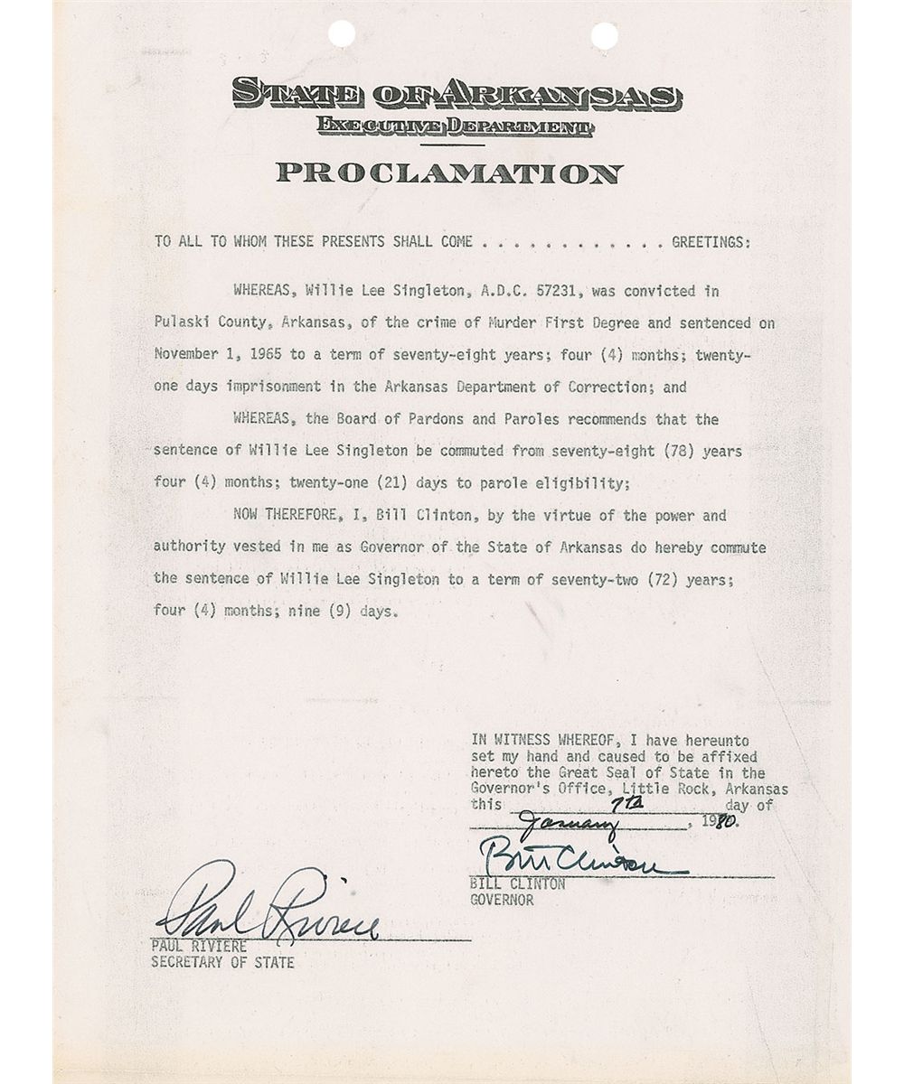 DS one page, 8.5 x 14, January 7, 1980. State of Arkansas proclamation commuting the sentence of a convicted murderer. In part: “Whereas Willie Lee Singleton, A.D.C.#57231, was convicted in Pulaski County, Arkansas of the crime of Murder First Degree and sentenced on November 21, 1965 to a term of seventy-eight years; four (4) months; twenty-one days imprisonment in the Arkansas Department of Correction; and Whereas, the Board of Pardons and Paroles recommends that the sentence of Willie Lee Singleton be commuted to parole eligibility; Now therefore, I, Bill Clinton, by the virtue of the power and authority vested in me as Governor of the State of Arkansas do hereby commute the sentence of Willie Lee Singleton to a term of seventy-two (72) years; four (4) months; nine (9) days." Signed at the conclusion in black ink by Clinton, and countersigned by Secretary of State Paul Riviere. In fine condition, with expected document wear.