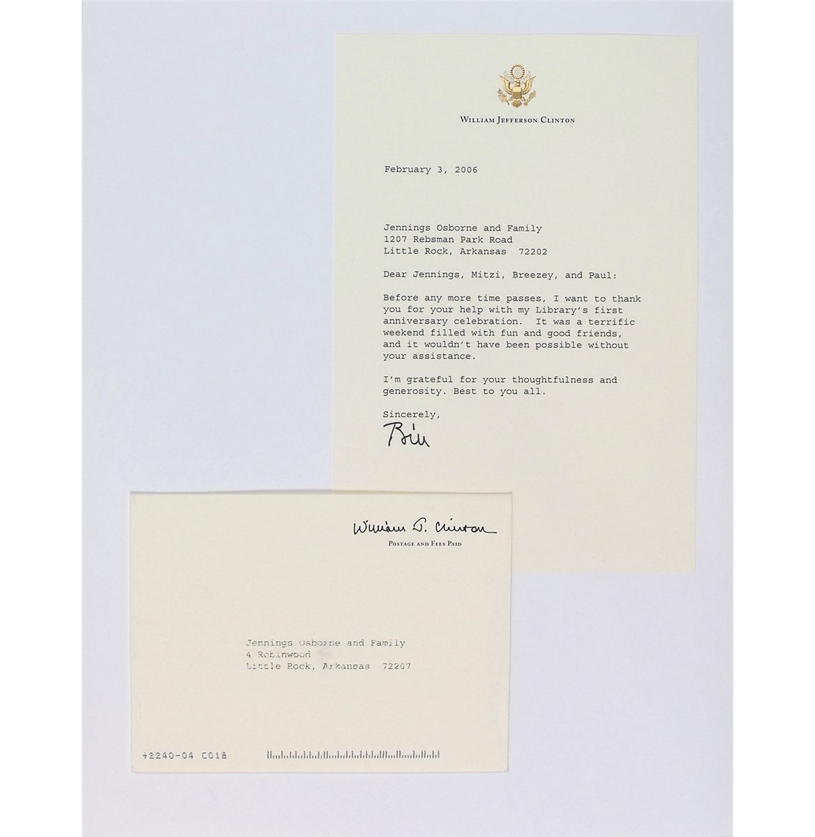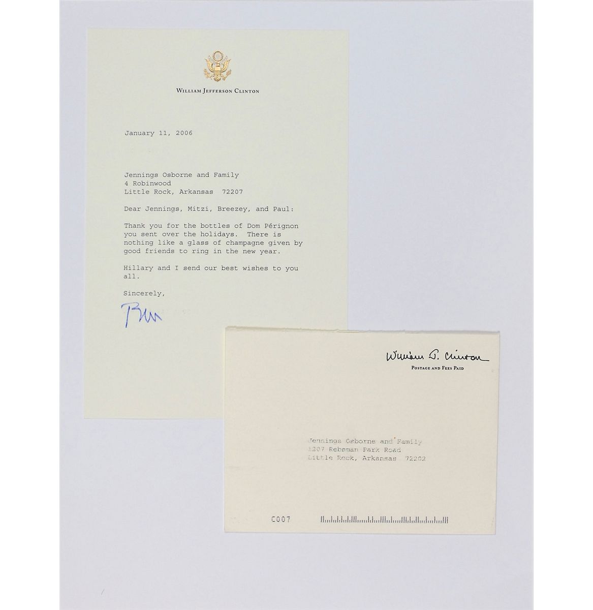 Two TLSs, both signed “Bill,” each 6.25 x 9.25, both dated 2006, and both to the Osbourne family, both sending thanks for sent bottles of champagne and his library’s first anniversary. Letters are affixed to opposite sides of a 12 x 14.5 scrapbook page, along with the original mailing envelopes. In fine condition.