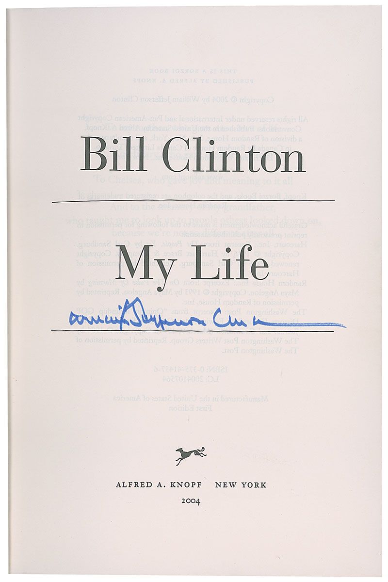 Signed book: My Life. First edition. NY: Alfred A. Knopf, 2004. Hardcover with dust jacket, 6.5 x 9.25, 957 pages. Signed on the title page in blue ink, “William Jefferson Clinton.” Autographic condition: fine. Book condition: VG+/VG+. Navy paper-covered boards with gilt title to spine; minor creasing to spine-ends, otherwise NF condition. Dust jacket has light creasing at corners and spine-ends and minor soiling.
