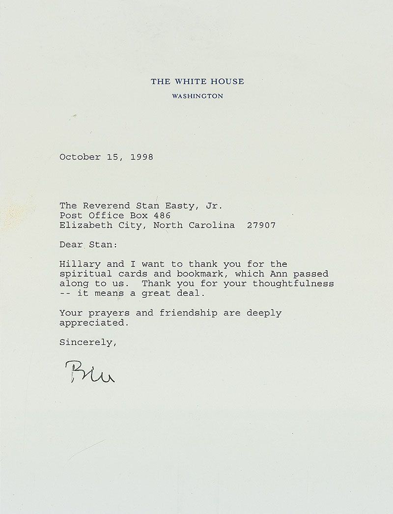 TLS as president signed “Bill,” one page, 6.75 x 9, White House letterhead, October 15, 1998. Clinton writes to Reverend Stan Easty in North Carolina, one of his closest friends and spiritual advisors. In full: “Hillary and I want to thank you for the spiritual cards and bookmark, which Ann passed along to us. Thank you for your thoughtfulness—it means a great deal. Your prayers and friendship are deeply appreciated.” In fine condition.