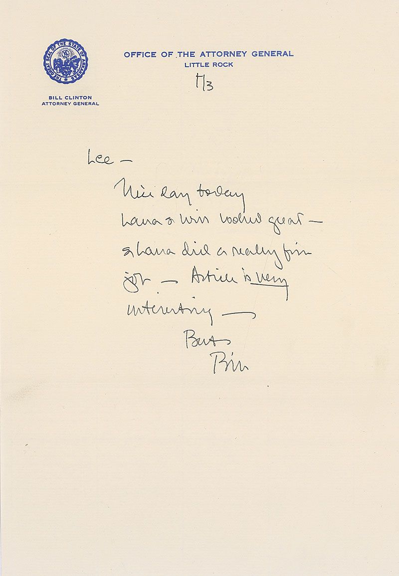 ALS signed “Bill,” one page, 7 x 10.5, Office of the Attorney General letterhead, April 3, 1978. Brief letter to Lee Jones. In full: “Nice day today. Lana & Win looked great—& Lana did a really fine job—Article is very interesting.” In very fine condition. Accompanied by the original mailing envelope addressed in Clinton’s hand.