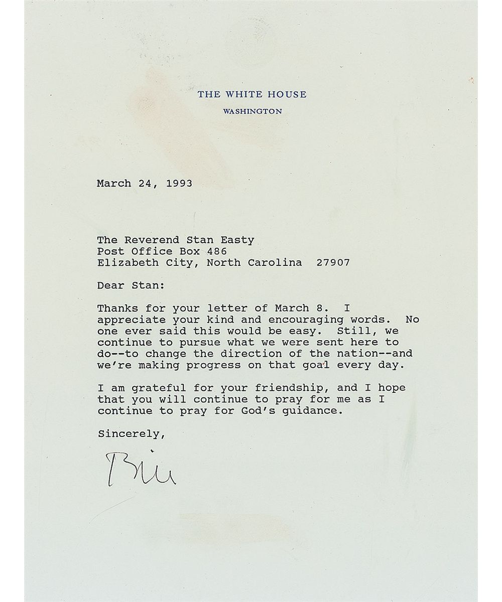 TLS signed “Bill,” one page, 6.75 x 8.75, White House letterhead, March 24, 1993. Letter to Reverend Stan Easty, a close friend and spiritual guide. In part: “I appreciate the encouraging words. No one ever said this would be easy. Still, we continue to pursue what we were sent here to do—to change the direction of the nation—and we’re making progress on that goal every day. I am grateful for your friendship, and I hope that you will continue to pray for me as I continue to pray for God’s guidance.” In fine condition, with mild show-through from adhesive remnants to reverse. Clinton wrote this letter just three months after taking office, having just unveiled his economic plan to reduce the deficit rather than cut taxes. A fantastic letter from the very beginning of his presidency.