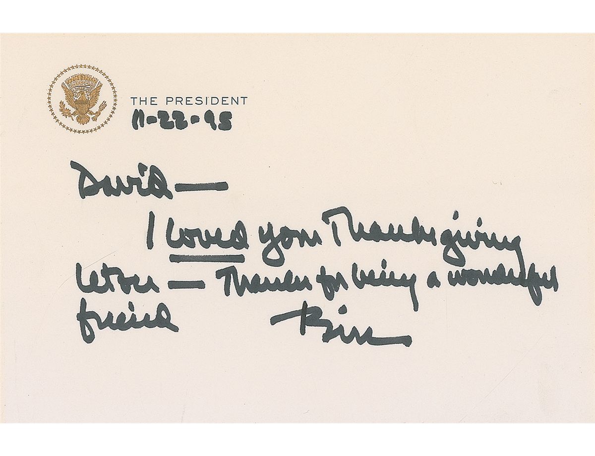 ALS as president signed “Bill,” one page on a 6.25 x 4.25 presidential stationery card, November 23, 1995. A brief note to “David.” In full: “I loved your Thanksgiving letter—Thanks for being a wonderful friend.” In fine condition, with trivial surface loss to top edge of reverse from previous mounting. Presidential letters by Clinton are relatively scarce, and this example was penned on a particularly notable date—the 32nd anniversary of the assassination of John F. Kennedy.