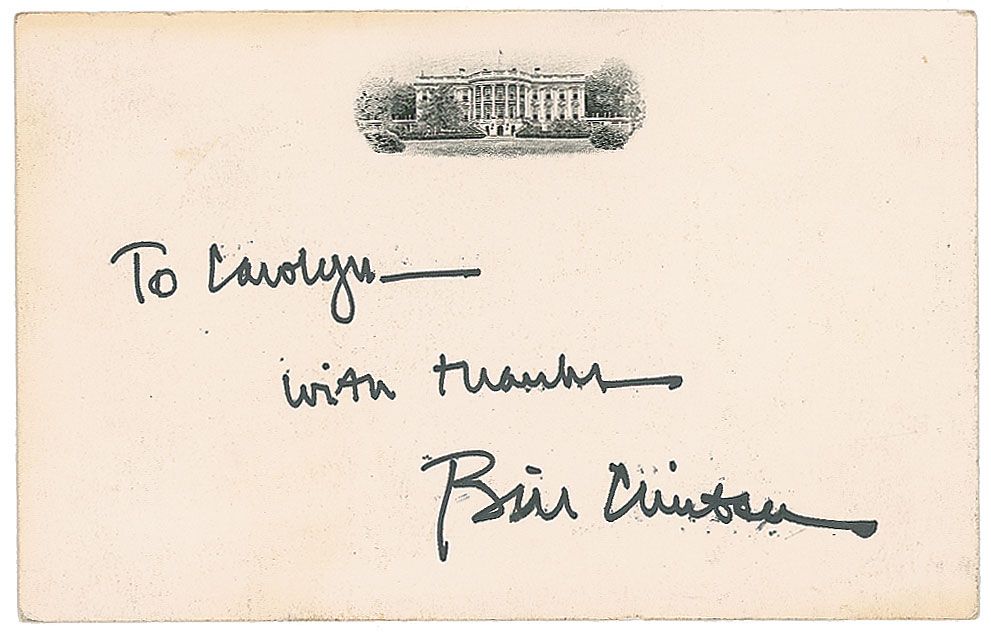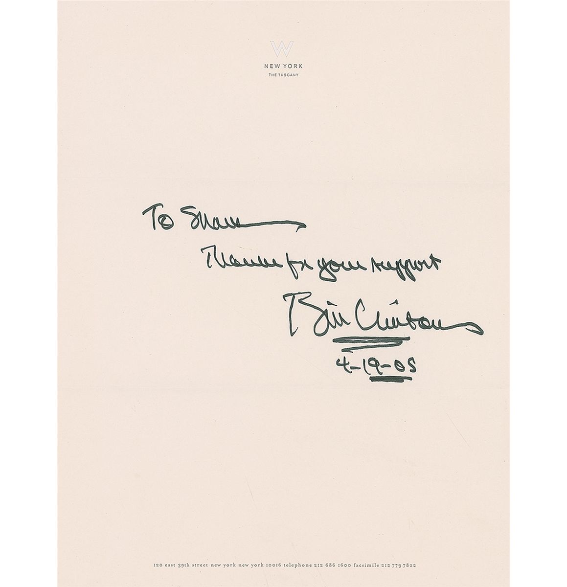 Felt tip signature and inscription, “To Carolyn—with thanks, Bill Clinton,” on an off-white 6.5 x 4 card with an engraved vignette of the White House at the top; and a felt tip signature and inscription, “To Shawn—Thanks for your support, Bill Clinton, 4-19-05,” on an off-white 8.5 x 11 sheet of New York, The Tuscany letterhead. Some mild toning and stray ink marks to card, otherwise fine condition.
