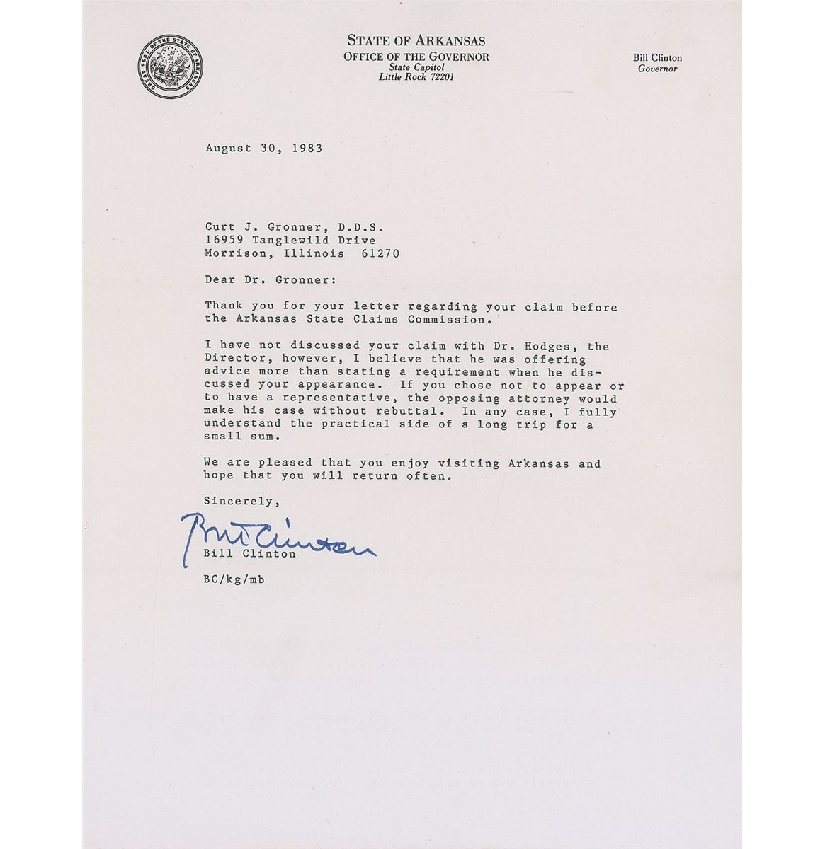 TLS, one page, 8.5 x 11, State of Arkansas letterhead, August 30, 1983. Letter to an Illinois dentist. In part: “Thank you for your letter regarding your claim before the Arkansas State Claims Commission…If you choose not to appear or to have a representative, the opposing attorney would make his case without rebuttal. In any case, I fully understand the practical side of a long trip for a small sum.” In fine condition. Accompanied by an unsigned color glossy photo.
