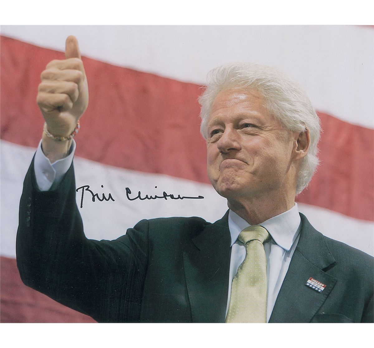 Color glossy 10 x 8 photo of Clinton giving a ‘thumbs-up,’ signed in black felt tip. In fine condition.