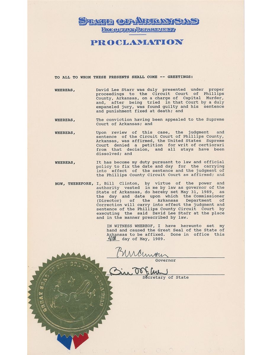 DS, one page, 8.5 x 14, May 4, 1989. Clinton sets an execution date for convicted murderer David Lee Starr. In part: “David Lee Starr was duly presented under proper proceedings…and, after being tried in that Court by a duly empaneled jury, was found guilty and his punishment fixed at death…Now, Therefore, I, Bill Clinton, by virtue of the power and authority vested in me by law as governor of the State of Arkansas, do hereby set May 31, 1989, as the day and date upon which the Commissioner (Director) of the Arkansas Department of Correction will carry into effect the judgment and sentence of the Phillips County Circuit Court by executing David Lee Starr at the place and in the manner prescribed by law.” Signed at the conclusion by Clinton and countersigned by his secretary of state. The gold foil seal and ribbon are crisp and intact. In fine condition. Starr was convicted for the capital murder of a 76-year-old woman, which was later reversed by the 8th Circuit US Court of Appeals.
