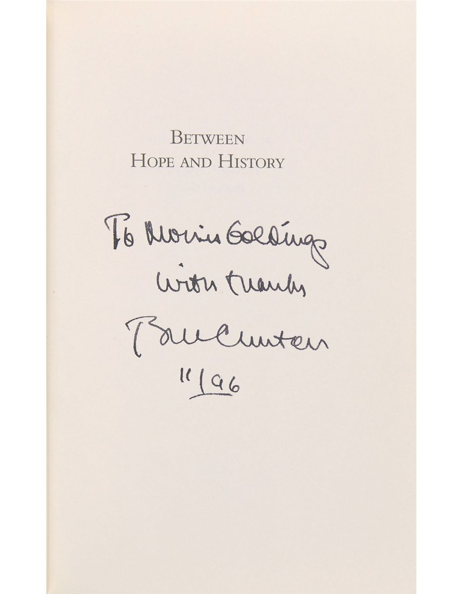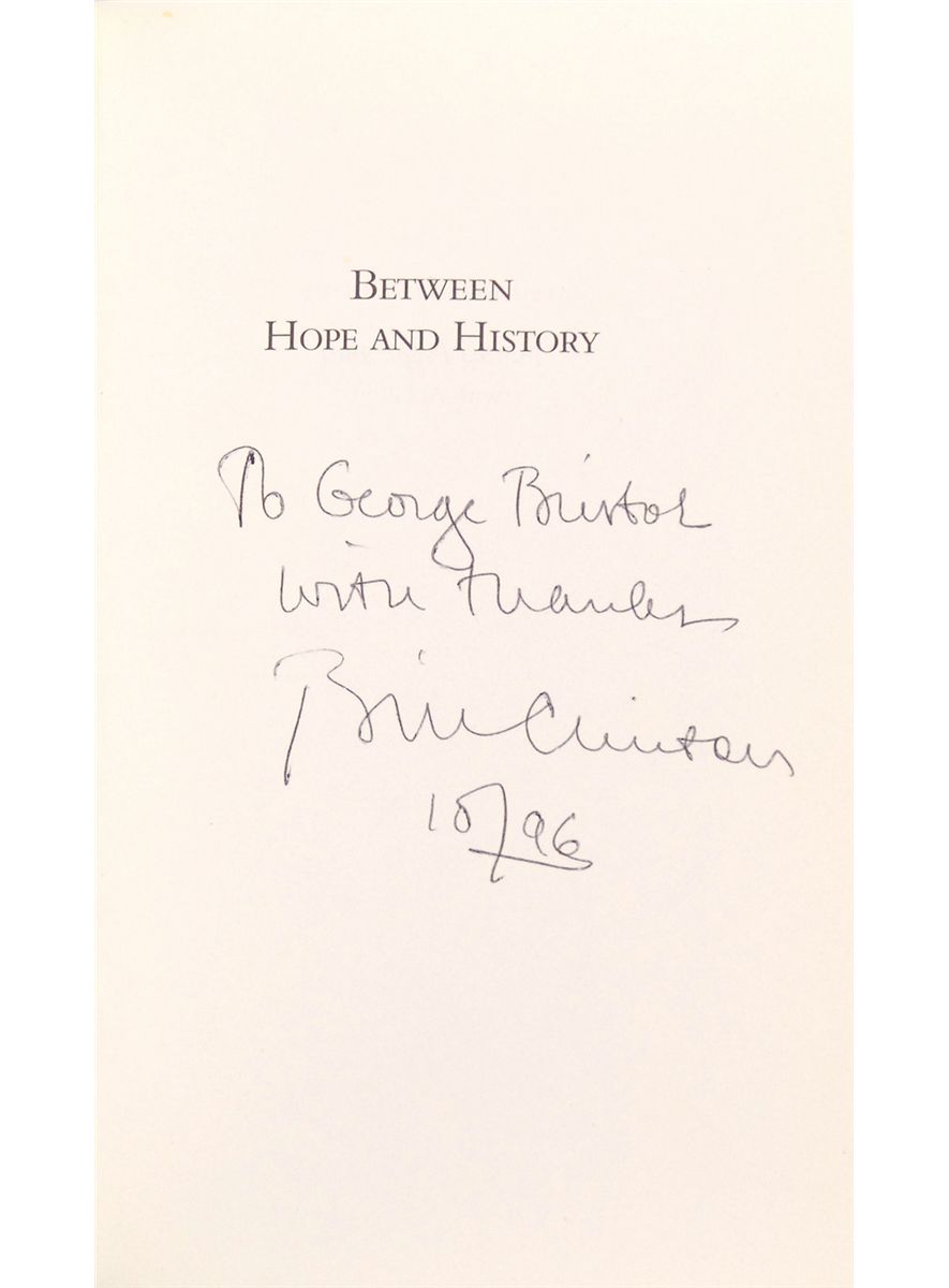 Two hardcover editions of Between Hope and History, each signed and inscribed as president on the half-title page and dated 1996. In overall fine condition.