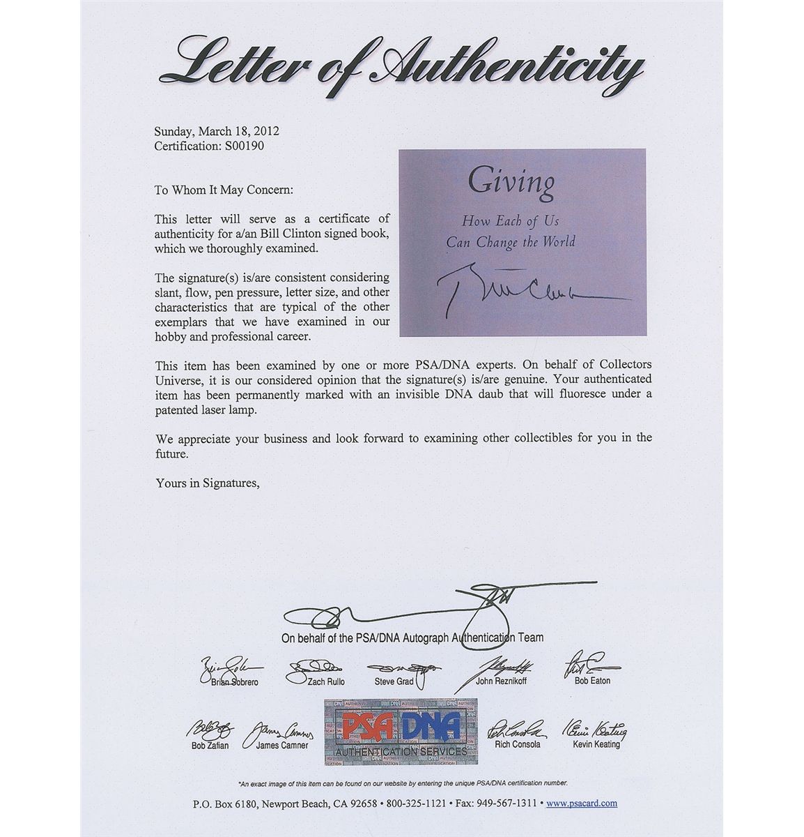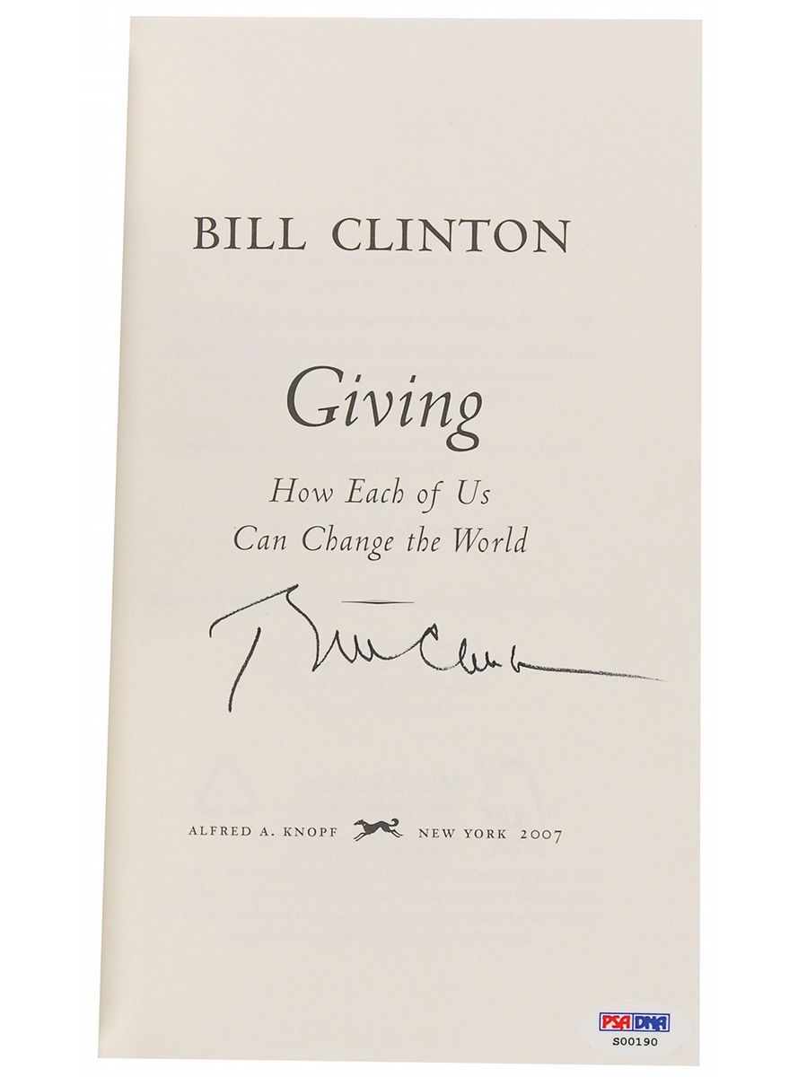 Signed book: Giving. First edition. NY: Alfred A. Knopf, 2007. Hardcover with dust jacket, 6 x 9.5, 240 pages. Signed on the title page in black felt tip. In fine condition, with an ownership notation to rear end page and a PSA/DNA label affixed to the title page. Accompanied by a letter of authenticity from PSA/DNA.
