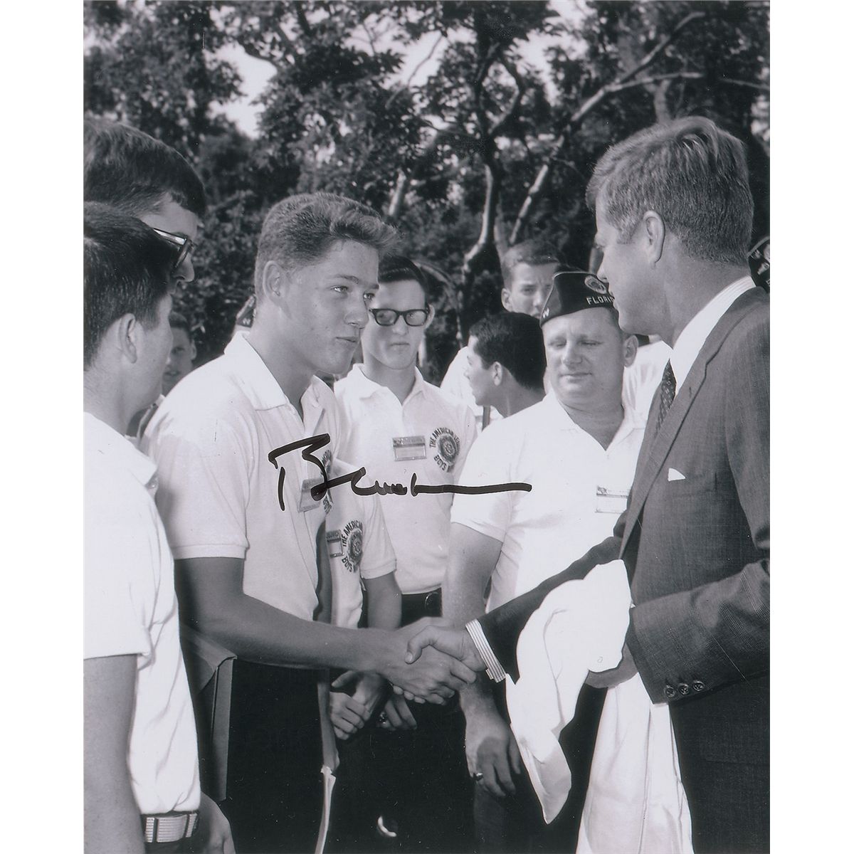 Fantastic glossy 8 x 10 photo of Clinton as a delegate to the American Legion Boys Nation, shaking hands with President Kennedy in Washington, DC, in 1963, signed in black felt tip. In fine condition, with faint impressions (from a note written on a piece of paper laid on top of the photo).
