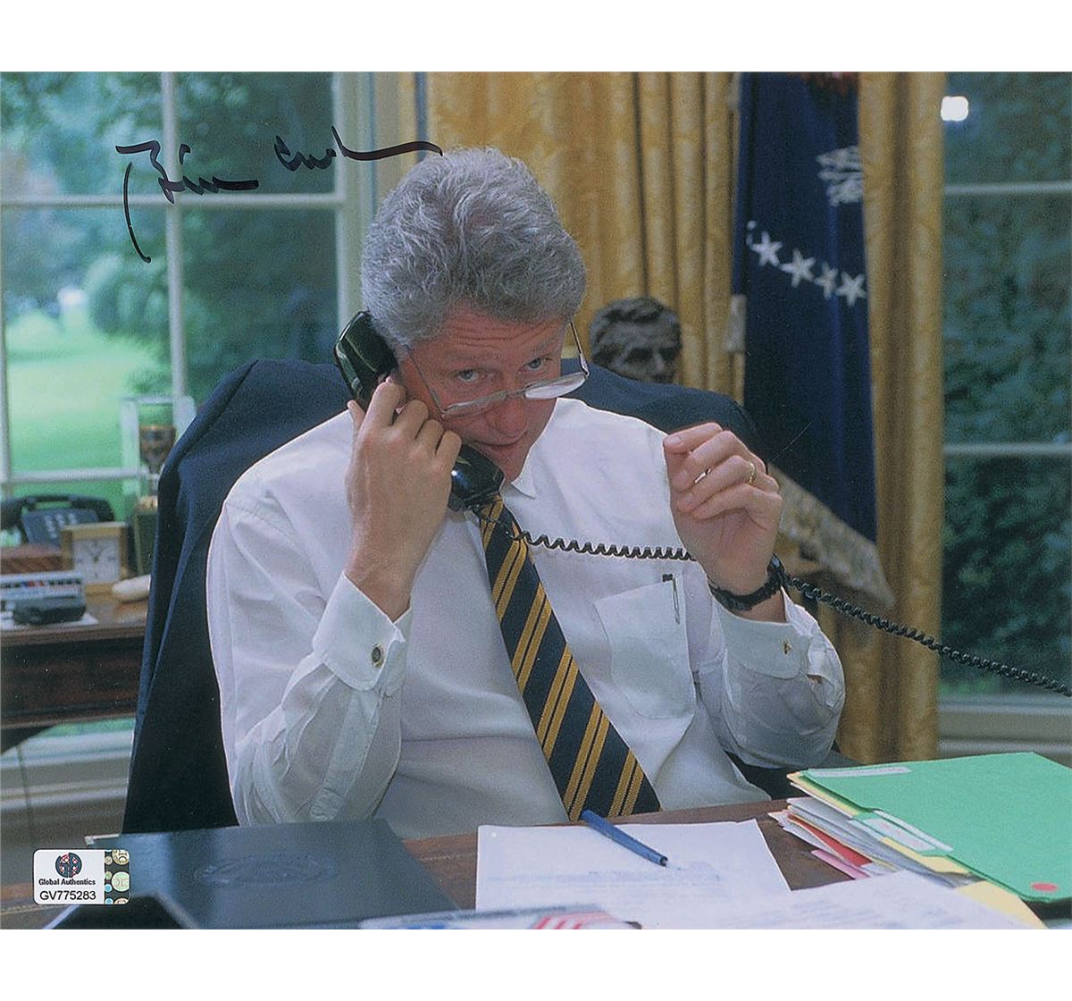 Color glossy 10 x 8 photo of Clinton talking on the phone in the Oval Office, signed in black felt tip. In fine condition, with an authentication label affixed to the lower left corner.