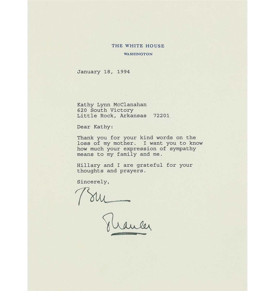 TLS as president signed “Bill, Thanks,” one page, 6.75 x 8.75, White House letterhead, January 18, 1994. Letter to Kathy Lynn McClanahan, in full: “Thank you for your kind words on the loss of my mother. I want you to know how much your expression of sympathy means to my family and me. Hillary and I are grateful for your thoughts and prayers.” In fine condition.
