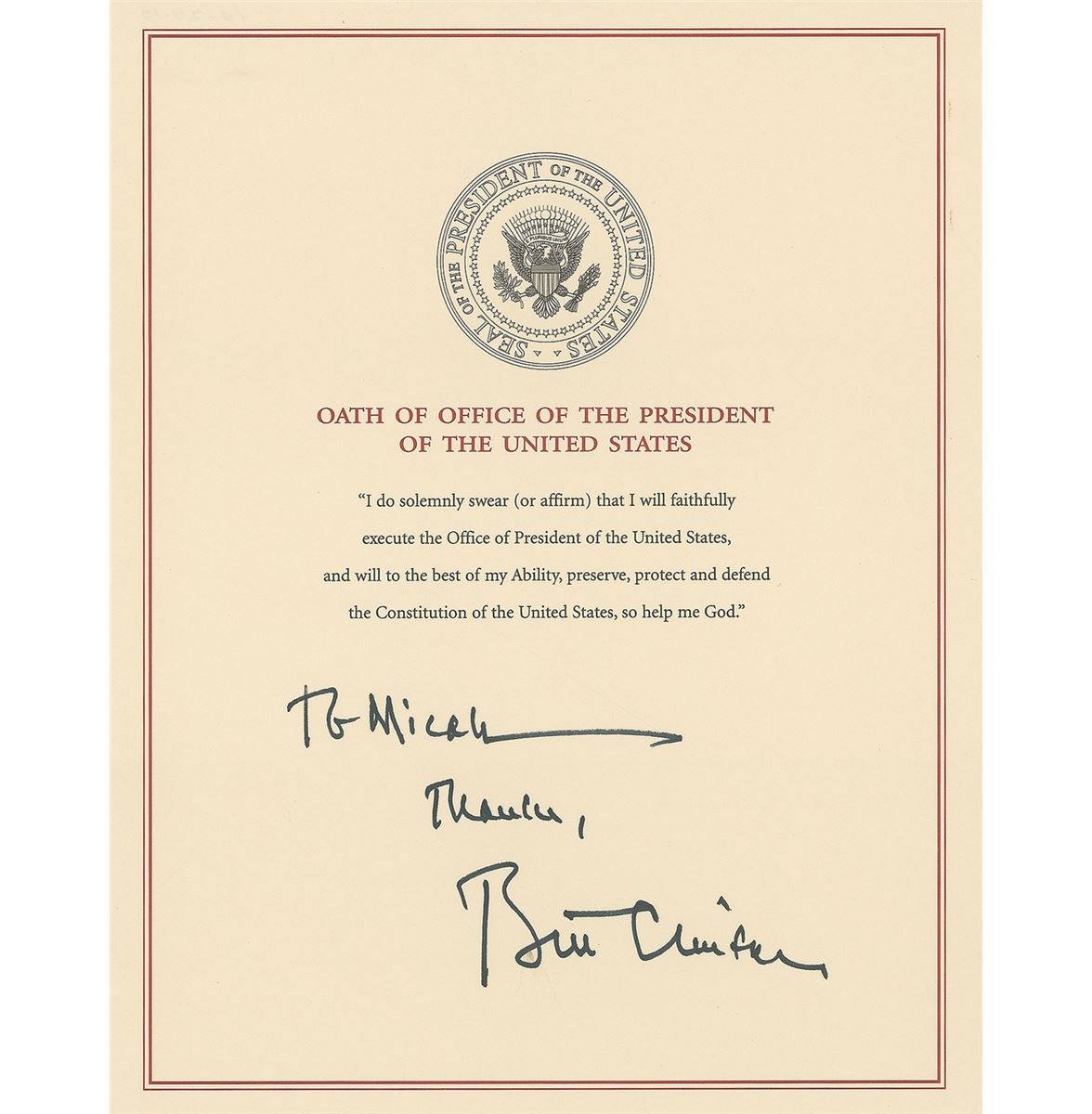 Red line copy of the Oath of Office, 8.5 x 11, signed and inscribed at the bottom in black felt tip, “To Micah, Thanks, Bill Clinton.” In full, “I do solemnly swear (or affirm) that I will faithfully execute the Office of President of the United States, and will to the best of my Ability, preserve, protect and defend the Constitution of the United States, so help me God.” Collector’s notations on reverse indicate the signature was obtained on October 10, 2010. In fine condition.