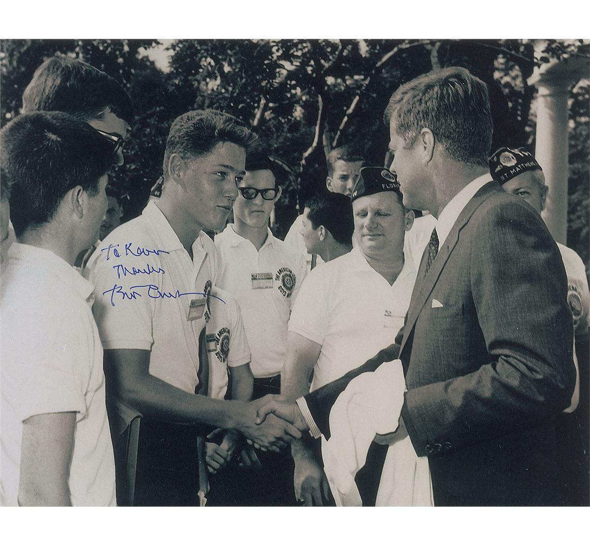 Satin-finish 10 x 8 photo of Boys Nation delegate Bill Clinton shaking hands with President John F. Kennedy on June 6, 1963, at the White House, signed and inscribed in blue ink, “To Kevin, Thanks, Bill Clinton.” Collector’s notations on reverse indicate that the signature was obtained on March 17, 2012. In very fine condition.