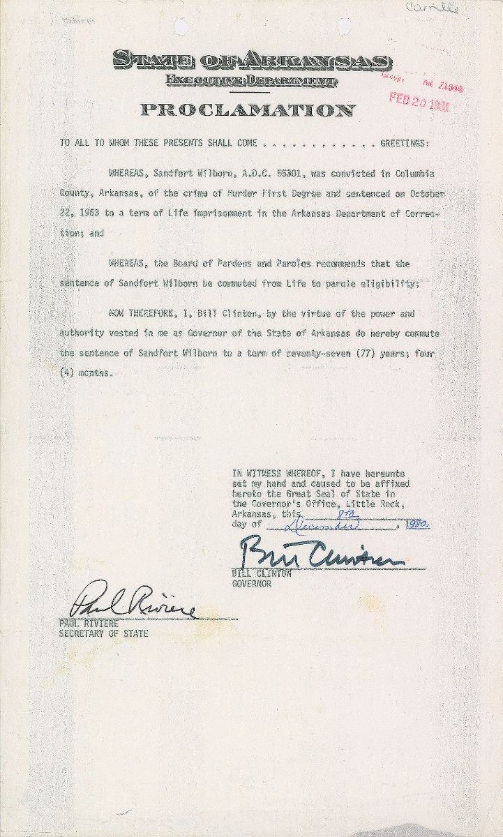 Uncommon DS, one page, 8.5 x 14, State of Arkansas letterhead, December 8, 1980. Pardon reads, “Whereas Sandfort Wilborn, A.D.C. 55301, was convicted in Columbia County, Arkansas of the crime of Murder First Degree and sentenced on October 22 1963 to a term of life imprisonment in the Arkansas Department of Correction; and Whereas, the Board of Pardons and Paroles recommends that the sentence of Sandfort Wilborn be commuted from Life to parole eligibility; Now therefore, I, Bill Clinton, by the virtue of the power and authority vested in me as Governor of the State of Arkansas do hereby commute the sentence of Sandfort Wilborn to a term of seventy-seven (77) years; four (4) months.” Boldly signed at the bottom in black felt tip by Governor Clinton and countersigned by Secretary of State Paul Riviere. In very good to fine condition.