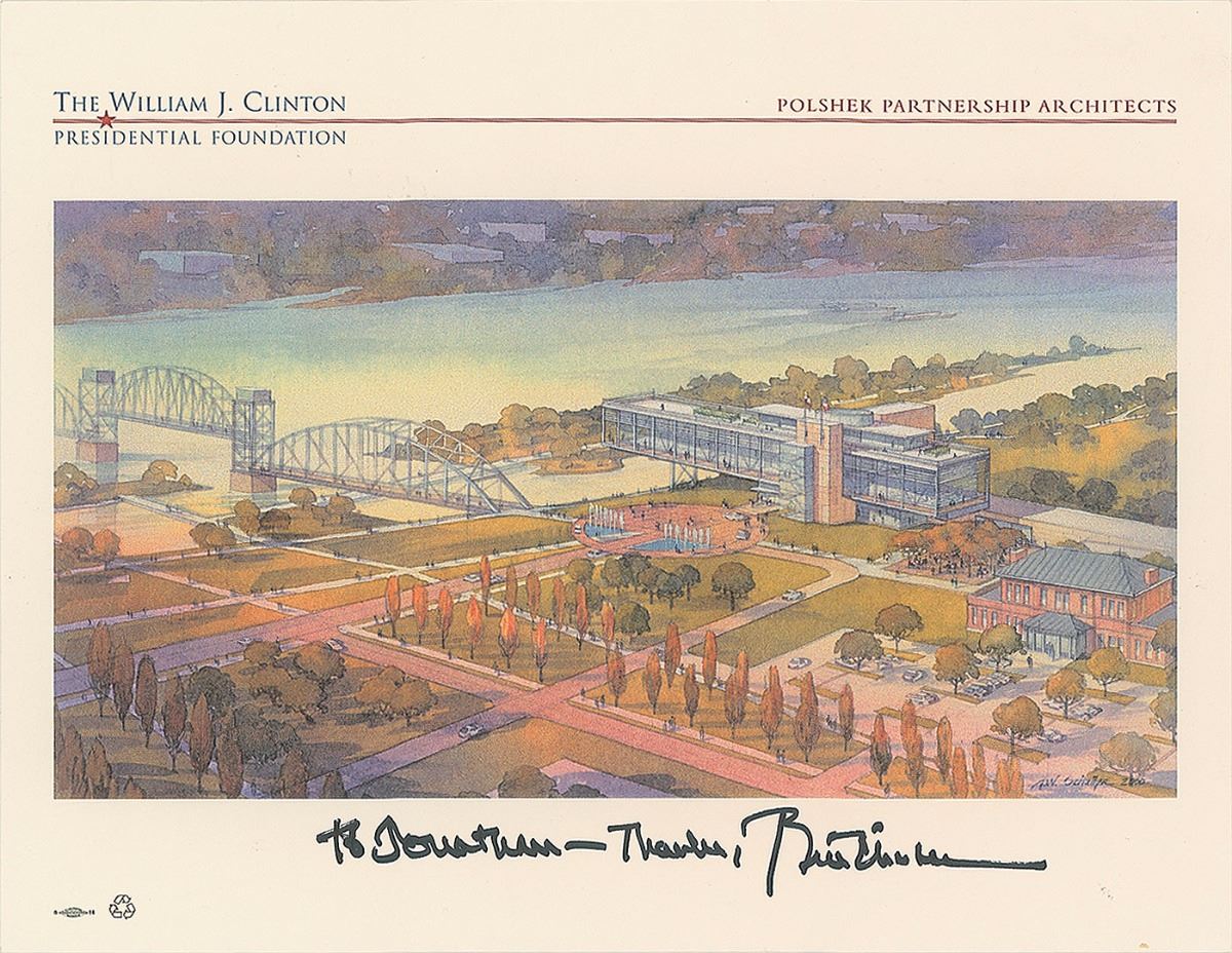 Color 11 x 8.5 print of the design for the Clinton Presidential Center by Polshek Partnership Architects, signed and inscribed in the lower border in black felt tip, “To Jonathan—Thanks, Bill Clinton.” In fine condition.