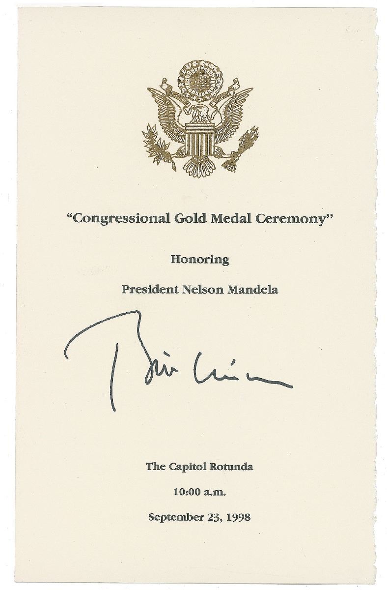 Program from the Congressional Gold Medal Ceremony honoring President Nelson Mandela at the Capitol Rotunda on September 23, 1998, 6 x 9.5, two pages, boldly signed on the front cover in black felt tip by Clinton. In fine condition.