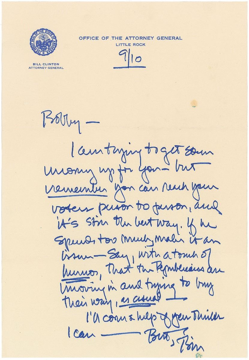 Early ALS signed “Bill,” one page, 7.25 x 10.5, Office of the Attorney General, Little Rock letterhead, September 10, [1978]. Letter to “Bobby.” In full: “I am trying to get some money up for you—but remember you can reach your voters person to person, and it’s still the best way. If he spends too much, make it an issue—Say, with a touch of humor, that the Republicans are moving in and trying to buy their way, as usual—I’ll come & help if you think I can.” In fine condition. The content of this letter dates it to the election year of 1978, in which Clinton easily won the Arkansas gubernatorial election after serving two years as attorney general. As revealed in this letter, he was already a savvy politician and strategic campaigner.