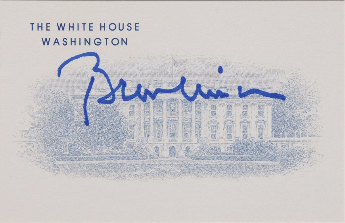 White House card with an attractive vignette, signed in blue felt tip by Clinton. In fine condition. Accompanied by copies of provenance from the original recipient and Clinton, as well as a full letter of authenticity from John Reznikoff/University Archives.