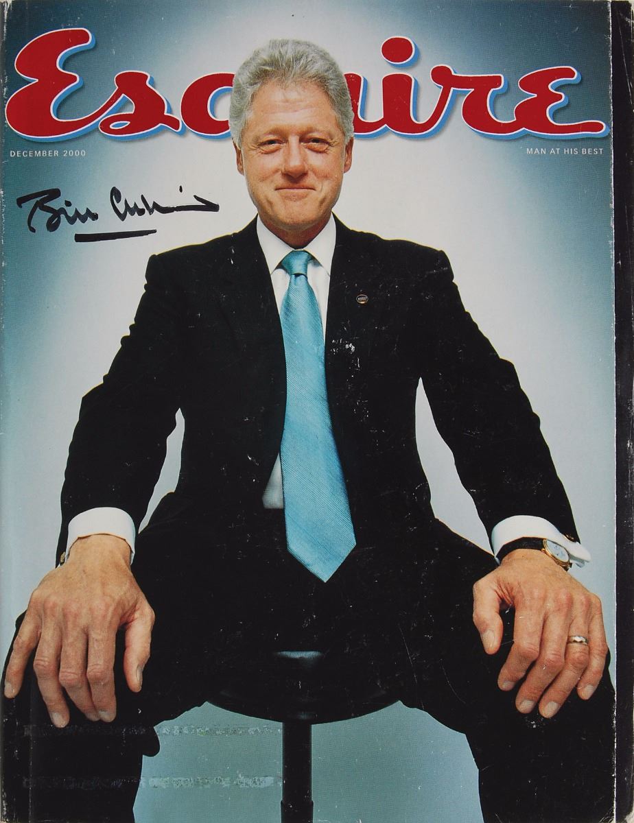 Esquire magazine from December 2000, showing Clinton on the front cover, 8.25 x 10.75, 182 pages, signed on the front cover in black felt tip. In fine condition, with slight scuffing and evidence of a removed mailing label.