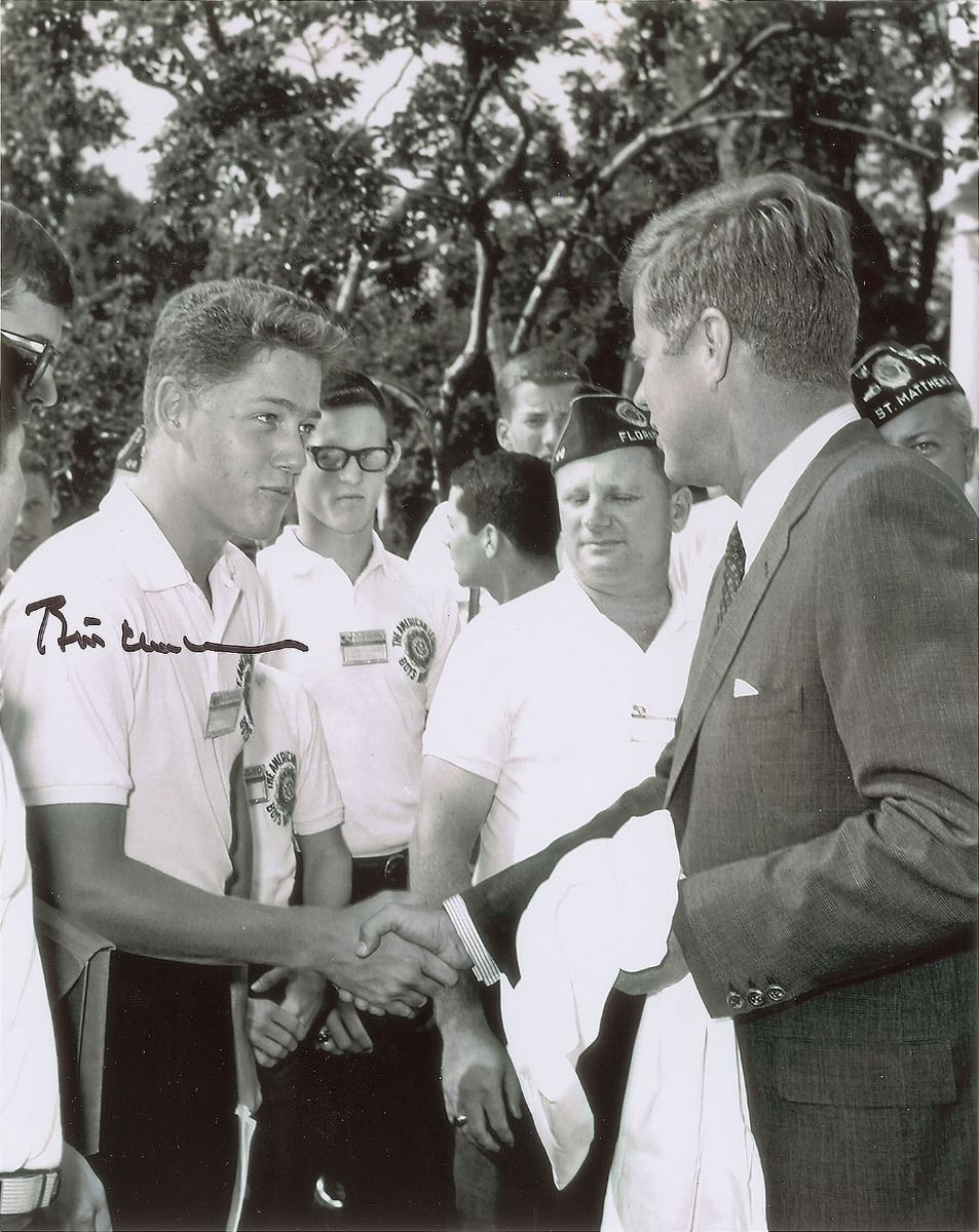Glossy 8 x 10 photo of Boys Nation delegate Bill Clinton shaking hands with President John F. Kennedy at the White House on June 6, 1963, signed in black felt tip by Clinton. In very fine condition.