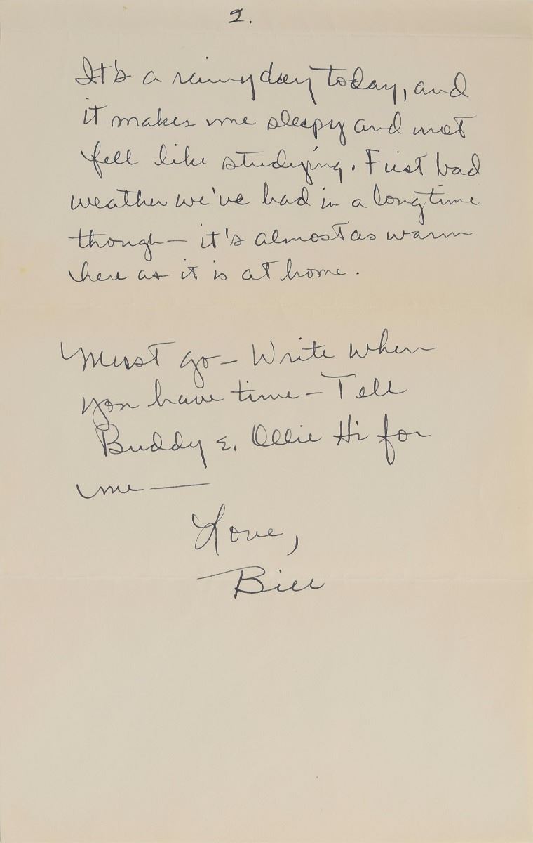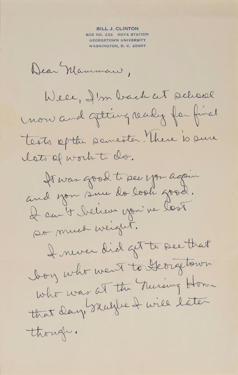 Early ALS signed “Bill,” two pages, 6 x 9.5, personal Georgetown University letterhead, no date, but between the years of 1964 and 1968. Letter to "Mammaw," his grandmother, Edith Cassidy, in full: "Well, I’m back at school now and getting ready for final tests of the semester. There is sure lots of work to do. It was good to see you again and you sure look good. I can’t believe you’ve lost so much weight. I never did get to see that boy who went to Georgetown who was at the nursing home that day. Maybe I will later though. It’s a rainy day today, and it makes me sleepy and not feel like studying. First bad weather we’ve had in a long time though—it’s almost as warm here as it is at home. Must go—write when you have time—Tell Buddy & Ollie Hi for me." In fine condition, with three horizontal mailing folds (one quite close to the top edge). Accompanied by three unsigned photos: two of Clinton as a child with his grandmother, and another of Clinton as a Georgetown graduate. As an undergraduate, Clinton enrolled at Georgetown University in Washington D.C., and attended the Edmund A. Walsh School of Foreign Service, ultimately receiving a Bachelor of Science in Foreign Service degree in 1968. In between classes, Clinton ran for President of the Student Council in 1964 and 1965, winning both of the campaigns. The death of Clinton's father three months before his birth forced his mother, Virginia Cassidy, and his grandmother, who Clinton affectionately refers to here as "Mammaw," to raise the child in rural Arkansas. When Virginia went to nursing school in New Orleans, Edith took full care of Clinton, teaching him to read under her strict tutelage. Handwritten Clinton letters remain exceedingly rare, with this example, written to a woman who was an enormous influence on his life, enhanced furthermore by the presence of the Georgetown letterhead.