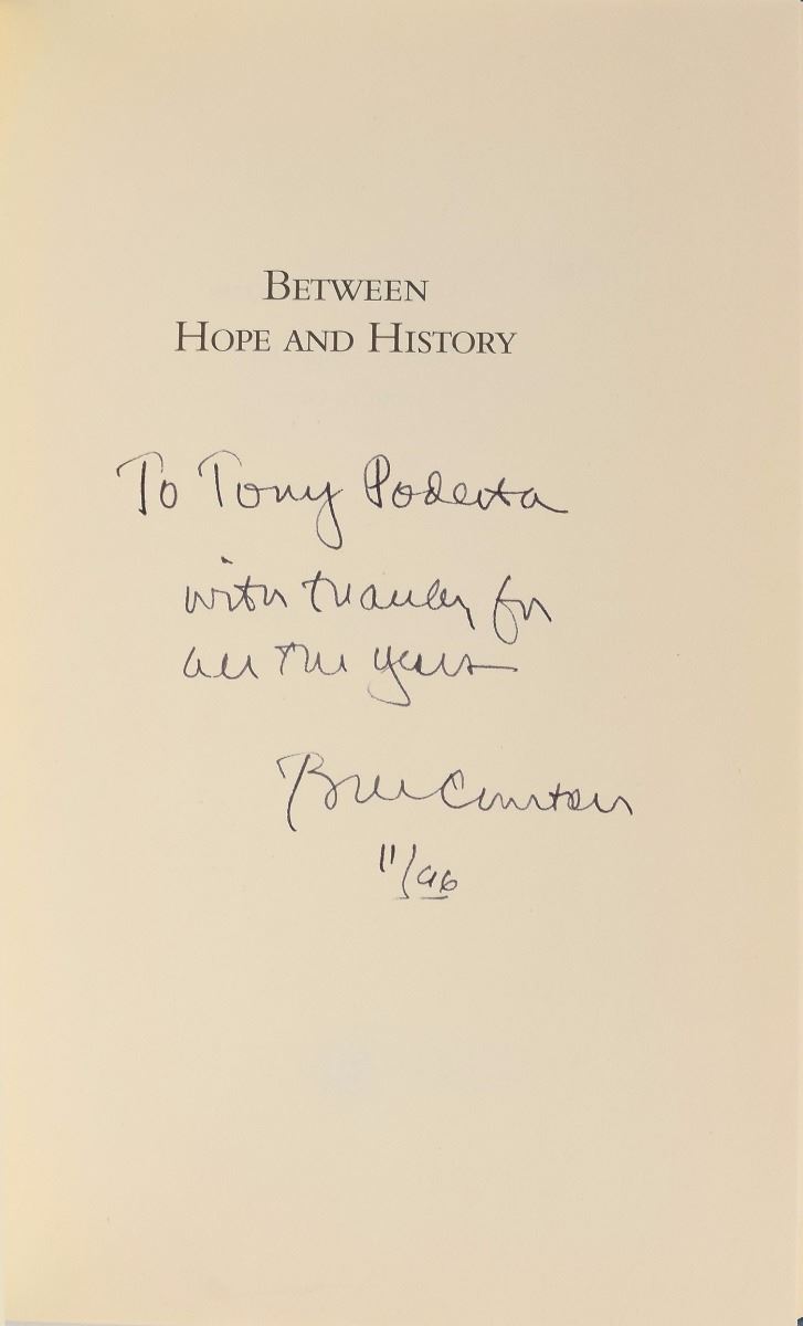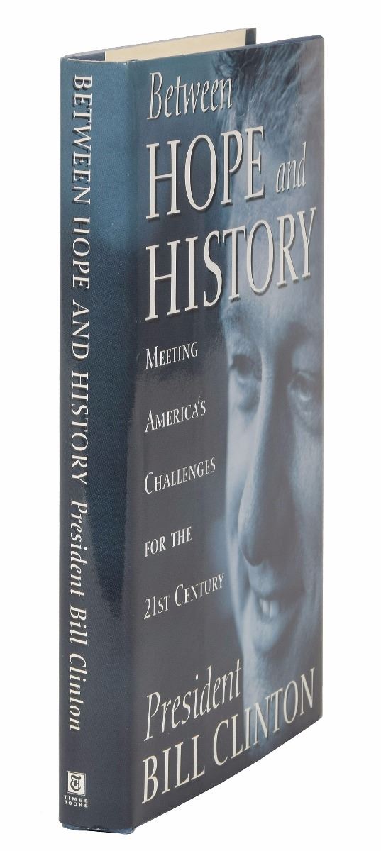 Signed book: Between Hope and History. NY: Random House, 1996. Hardcover with dust jacket, 5.5 x 8.25, 178 pages. Signed and inscribed on the half-title page in black ink, "To Tony Podenta, with thanks for all the years, Bill Clinton, 11/96." In very fine condition.
