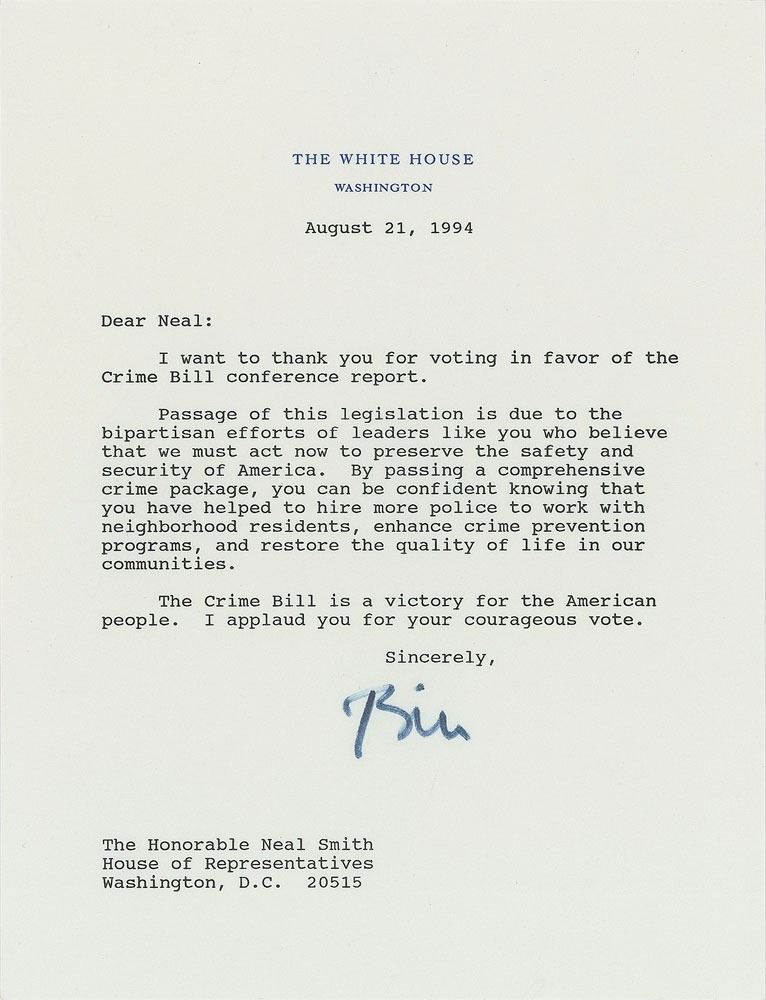 TLS as president signed “Bill,” one page, 6.75 x 8.75, White House letterhead, August 21, 1994. Letter to Congressman Neal Smith, in part: "I want to thank you for voting in favor of the Crime Bill conference report. Passage of this legislation is due to the bipartisan efforts of leaders like you who believe that we must act now to preserve the safety and security of America. By passing a comprehensive crime package, you can be confident knowing that you have helped to hire more police to work with neighborhood residents, enhance crime prevention programs, and restore the quality of life in our communities. The Crime Bill is a victory for the American people. I applaud your courageous vote." In very fine condition. The 1994 federal crime bill (the Violent Crime Control and Law Enforcement Act) has become one of the most controversial aspects of Clinton's legacy, largely due to its implementation of a 'three strikes' mandatory life sentence for repeat offenders. First Lady Hillary Clinton's use of the term 'superpredator' in association with the act came back to haunt her own presidential ambitions in 2016. A significant presidential letter concerning a major piece of legislation.