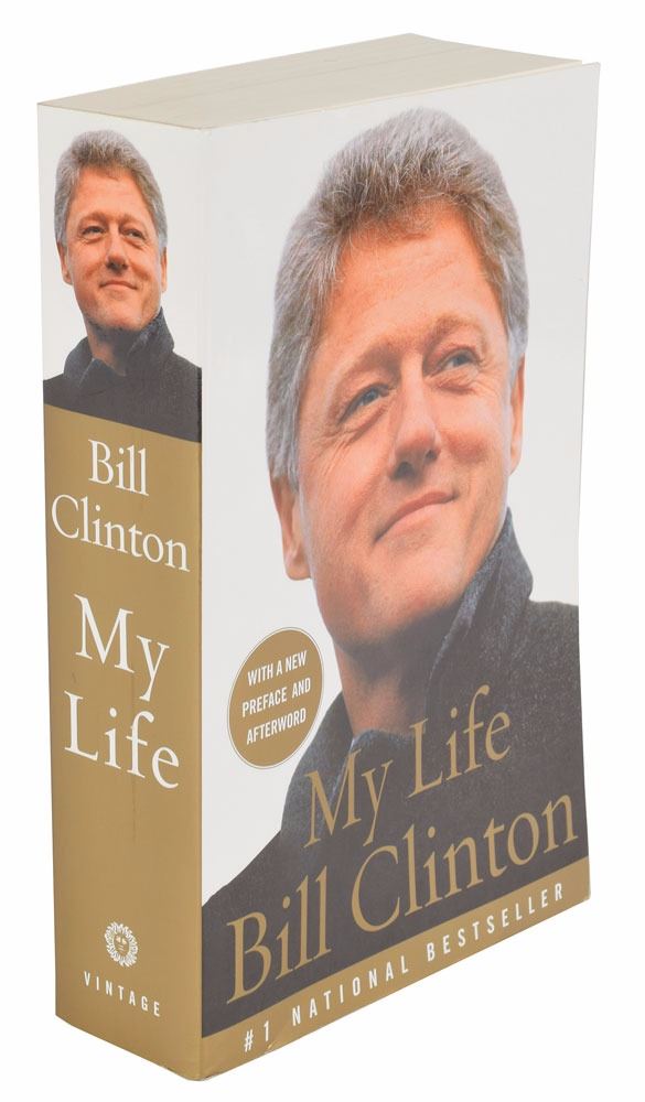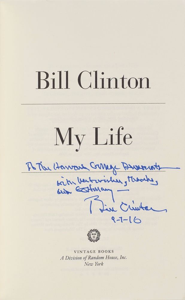 Signed book: My Life. First Vintage Books edition. NY: Vintage Books, 2005. Softcover, 5.25 x 8, 969 pages. Signed and inscribed on the title page in blue felt tip, "To the Howard College Democrats, with best wishes, thanks, and Go Hillary—Bill Clinton, 9–7–16." In fine condition.