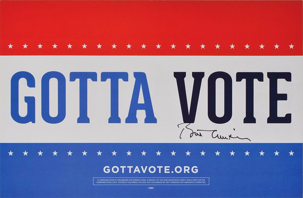 Patriotic 2012 Democratic "Gotta Vote" campaign sign, 17 x 11, signed in black felt tip by Clinton. In fine condition. Accompanied by four photos taken at a 2012 campaign rally in Pennsylvania, showing Clinton on stage and several of these signs within the crowd.