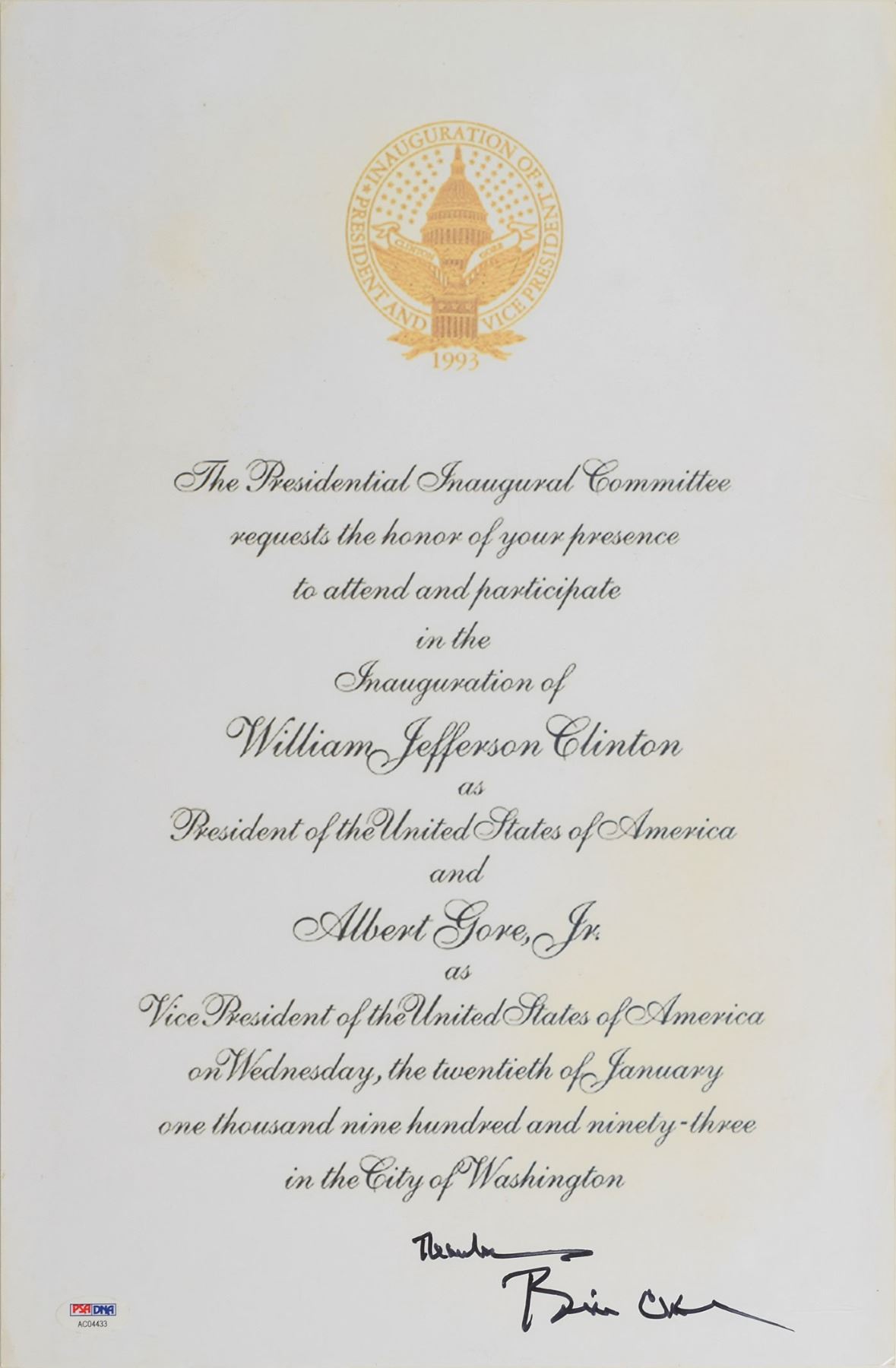 Color satin-finish 12 x 18 photo reproducing an invitation to Clinton's presidential inauguration in 1993, signed in black felt tip, "Thanks, Bill Clinton." In fine condition, with fuzziness to the text, some areas of mild discoloration, and a PSA/DNA label affixed to the lower left. Accompanied by a full letter of authenticity from PSA/DNA.