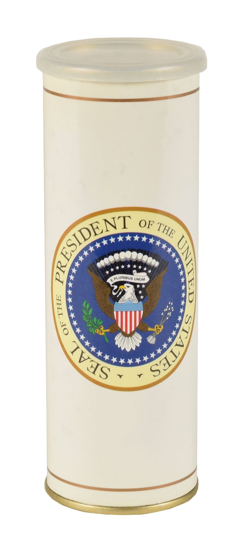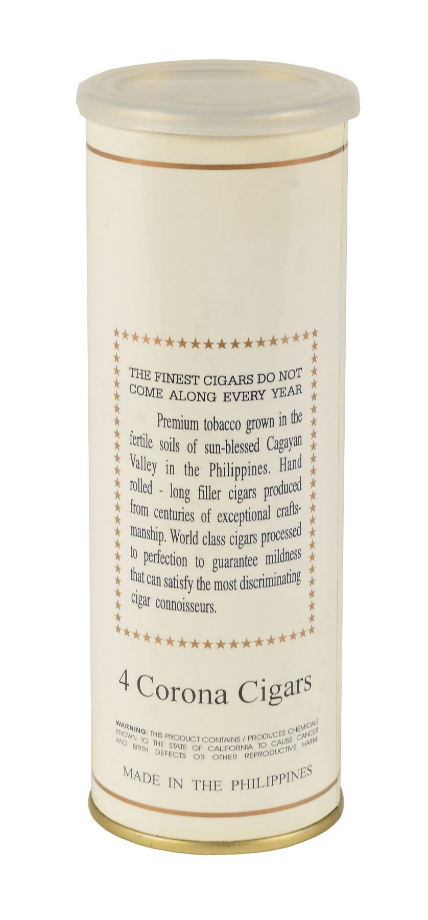 Still-sealed metal canister of four Corona cigars presented to White House visitors during the first term of President Clinton, measuring 6.25 ? tall and 2.25? in diameter, the off-white can label features the presidential seal and information text on reverse: "The finest cigars do not come along every year / Premium tobacco grown in the fertile soils of sun-blessed Cagayan Valley in the Philippines. Hand rolled—long filler cigars produced from centuries of exceptional craftsmanship. World class cigars processed to perfection to guarantee mildness that can satisfy the most discriminating cigar connoisseurs." In fine condition.