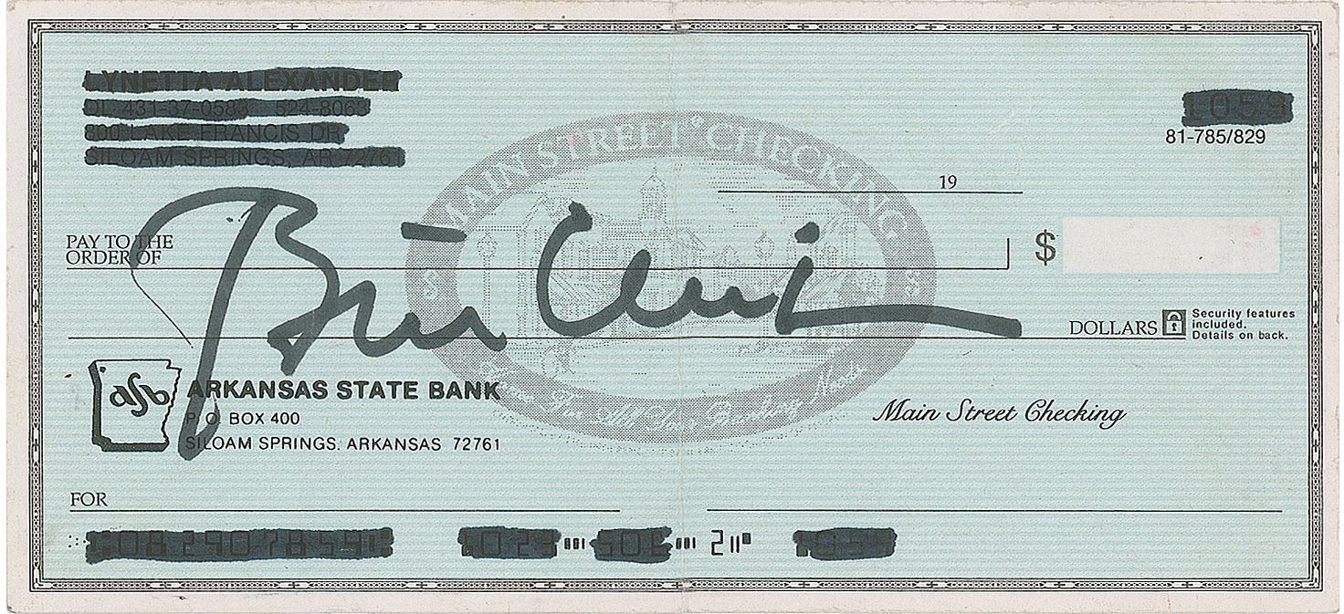 Large felt tip signature, "Bill Clinton,” on a light blue 6 x 2.75 Arkansas State Bank check. In very good to fine condition, with a central vertical fold.