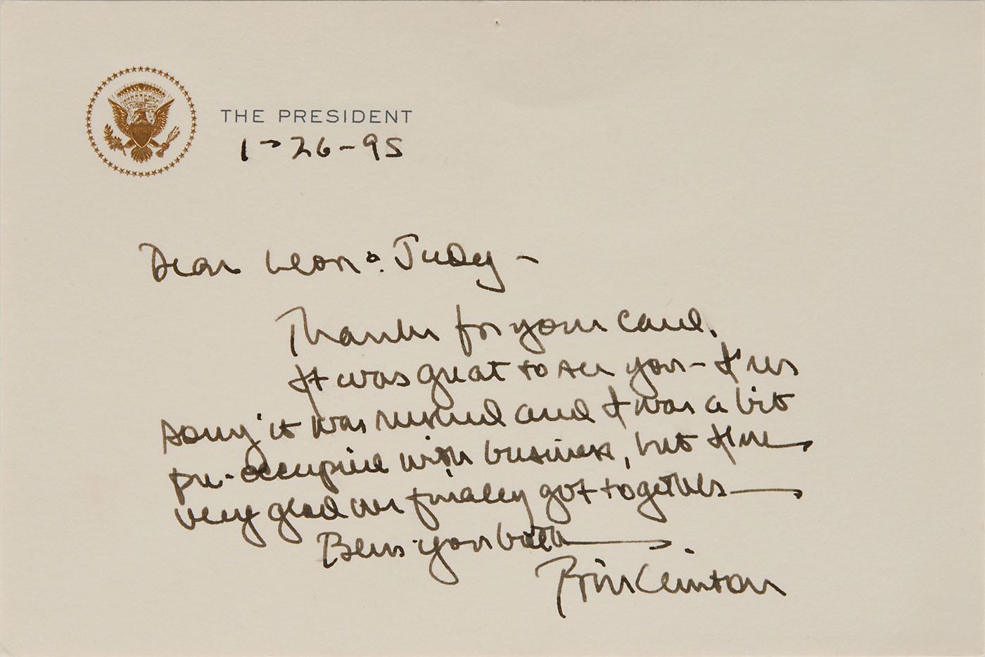 Scarce ALS as president, one page, 6.25 x 4.25, presidential stationery card, January 26, 1995. Letter to Henry Leon and Judy Ritzenthaler, in full: “Thanks for your card. It was great to see you—I’m sorry it was rushed and I was a bit preoccupied with business, but I’m very glad we finally got together. Bless you both.” In fine condition, with one tiny tack hole to the top edge. Accompanied by the original White House mailing envelope. Born William Jefferson Blythe III, President Clinton and the recipient of the letter, Henry Leon Ritzenthaler, share the same birth father, William Jefferson Blythe, with Henry Leon taking the name of the man who raised him, Charles Ritzenthaler.