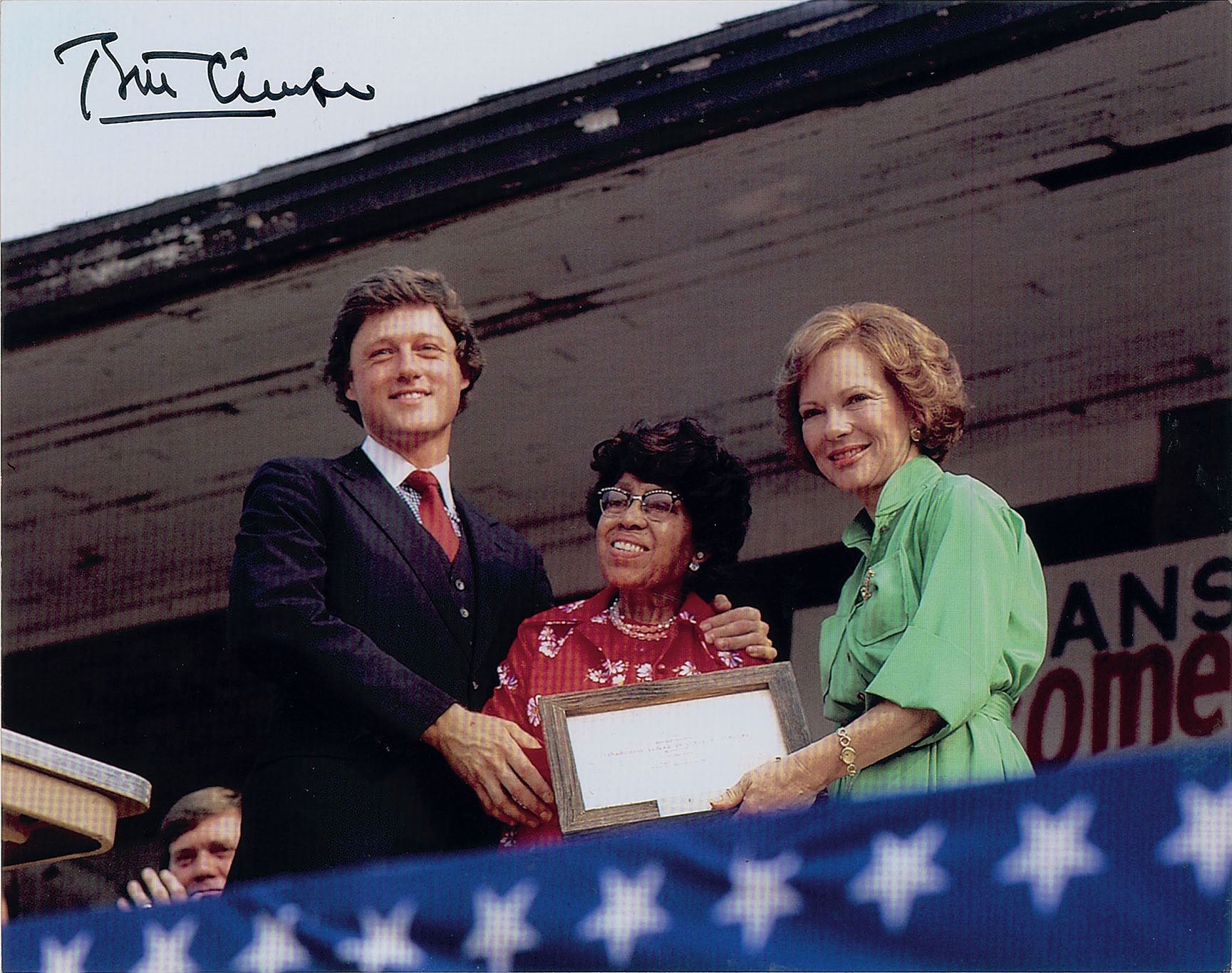 Color satin-finish 14 x 11 photo of Arkansas Governor Bill Clinton standing alongside Civil Rights activist Rosa Parks and First Lady Rosalynn Carter, signed in black felt tip by Clinton. In fine condition, with scattered light creasing.