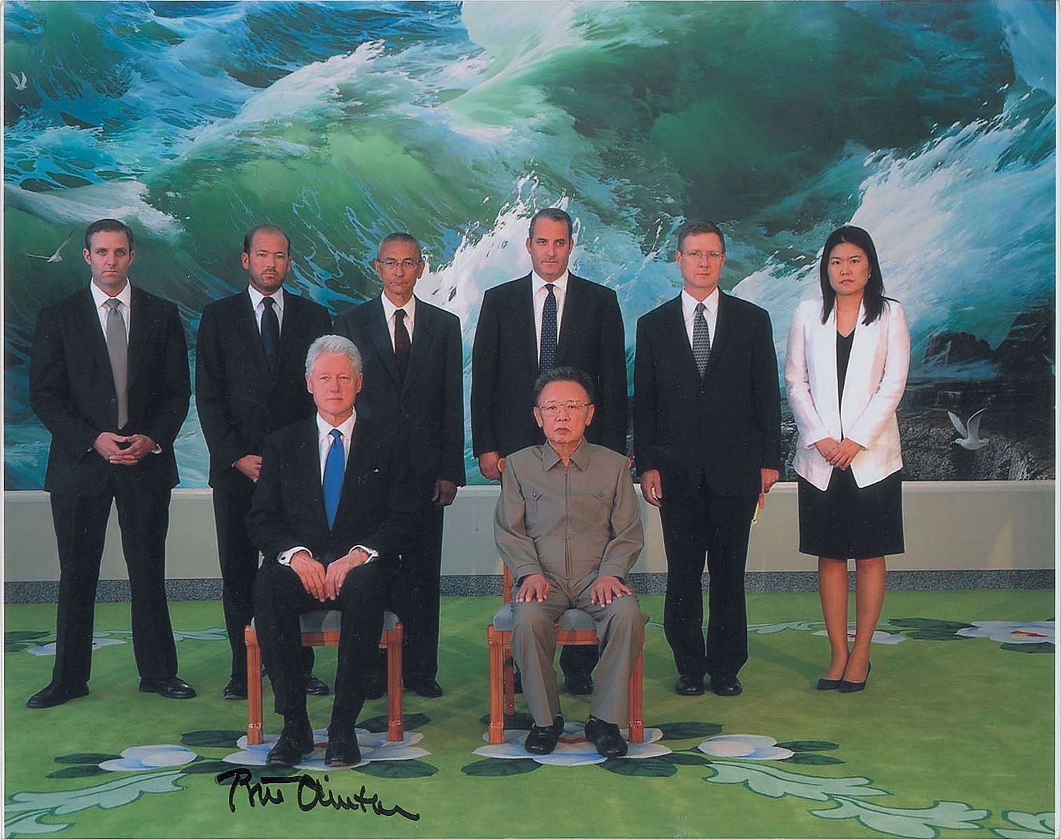 Color satin-finish 14 x 11 photo of North Korean leader Kim Jong Il posing with former US President Bill Clinton and members of his delegation in Pyongyang on August 4, 2009, signed in black felt tip by Clinton. In fine condition.