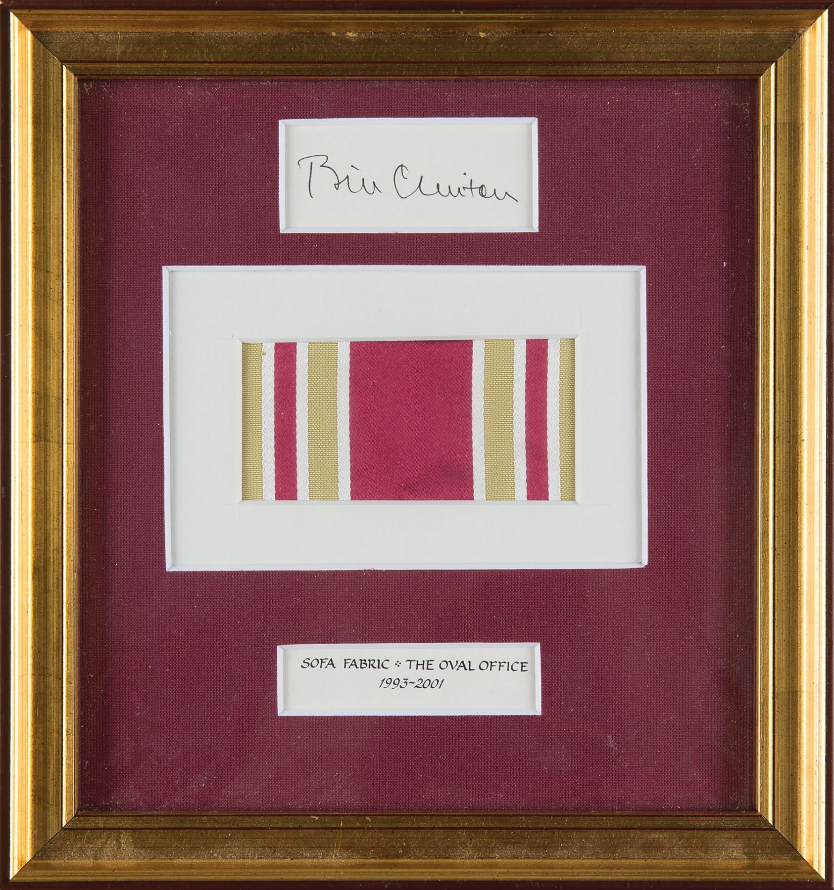 A swatch of maroon, white, and gold fabric from the couch that resided in the Oval Office during President Clinton’s time in the White House, measuring 3.5 x 1.75, displayed with a black ink signature, “Bill Clinton,” and a typed identification card inside a cloth-matted 8.5 x 9.25 frame. In very fine condition. An impressive Clinton-era Oval Office artifact worthy of a discriminating collector.
