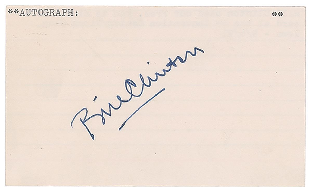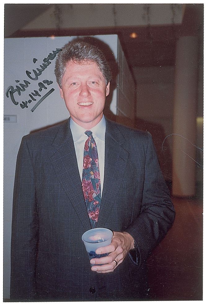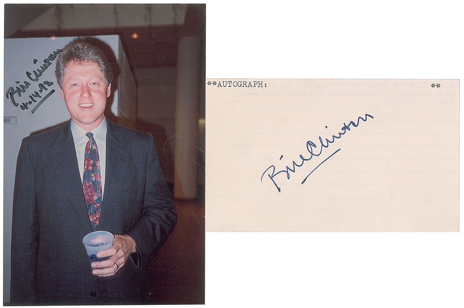 Two items: a color satin-finish 4 x 6 candid photo of Clinton before a press conference in 1991, signed in black felt tip, "Bill Clinton, 4-14-92," with typed collector's notations on the reverse indicating the date and place; and an ink signature, "Bill Clinton" on an off-white 5 x 3 card, with collector's notations on the reverse indicating that it was signed at the Sioux City Convention Center in Iowa on September 6, 1991. In very good to fine condition, with two paperclip impressions and a crease to the photo; the signed card is very fine.