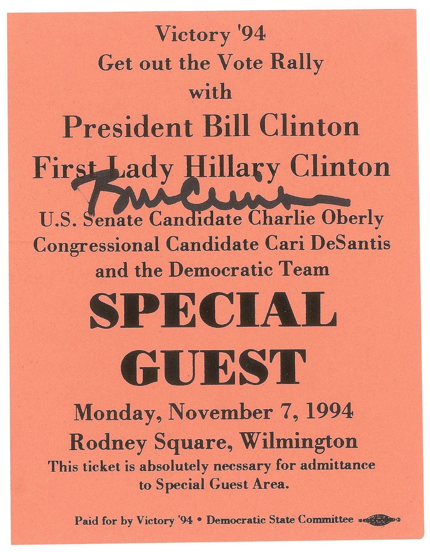 Uncommon 'special guest' ticket for a "Victory '94, Get out the Vote Rally" with President Bill Clinton and First Lady Hillary Clinton at Rodney Square in Wilmington, Delaware, on November 7, 1994, 4.25 x 5.5, signed in black felt tip by Bill Clinton. In very fine condition.