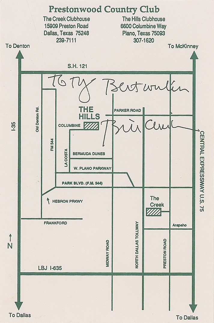 Ink signature and inscription, "To Ty, Best wishes, Bill Clinton,” on a 4 x 6 direction card from the Prestonwood Country Club in Texas. In very fine condition.