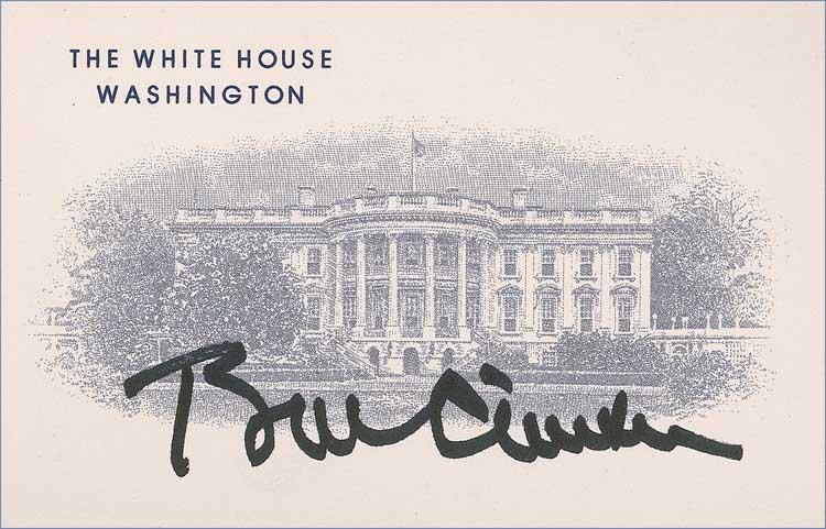 Uncommon signed White House card, 4 x 2.5, with a vignette of the south portico of the White House, boldy signed in black felt tip, “Bill Clinton.” In fine condition. Pre-certified PSA/DNA and RRAuction COA.