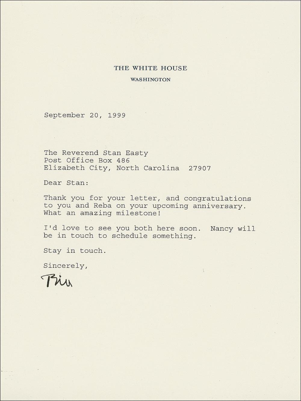 TLS as president signed “Bill,” one page, 6.75 x 9, White House letterhead, September 20, 1999. Letter of thanks to Reverend Stan Easty, one of Clinton’s closest friends and spiritual advisors. In full: “Thank you for your letter, and congratulations to you and Reba on your upcoming anniversary. What an amazing milestone! I’d love to see you both here soon. Nancy will be in touch to schedule something.” In fine condition, with a light vertical crease. Pre-certified John Reznikoff/PSA/DNA and RRAuction COA.