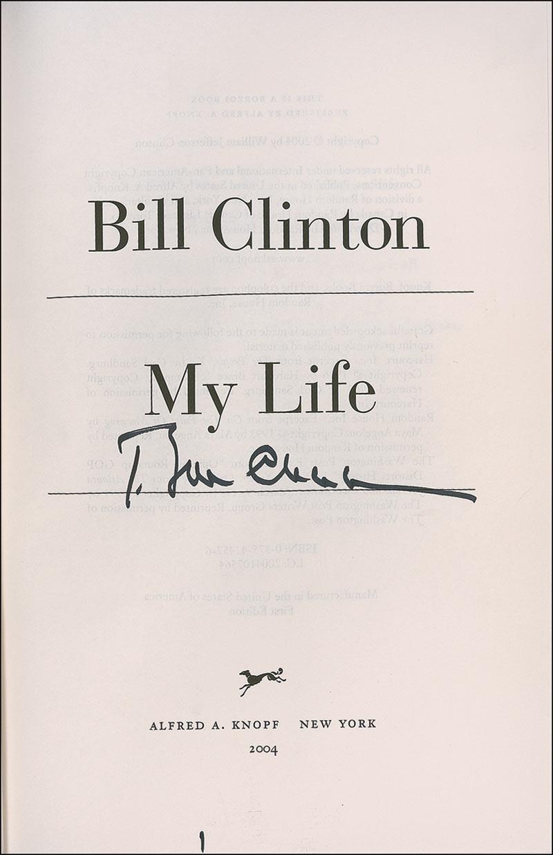 Signed book: My Life. First edition. NY: Alfred A. Knopf, 2004. Hardcover with dustjacket, 6.5 x 9.5, 957 pages. Signed on the title page in black felt tip. A few small dings and creases to dustjacket (as well as adhesive remnants from label), and some light staining to fore edges and light rippling to interior pages, otherwise fine condition. Pre-certified PSA/DNA and RRAuction COA.