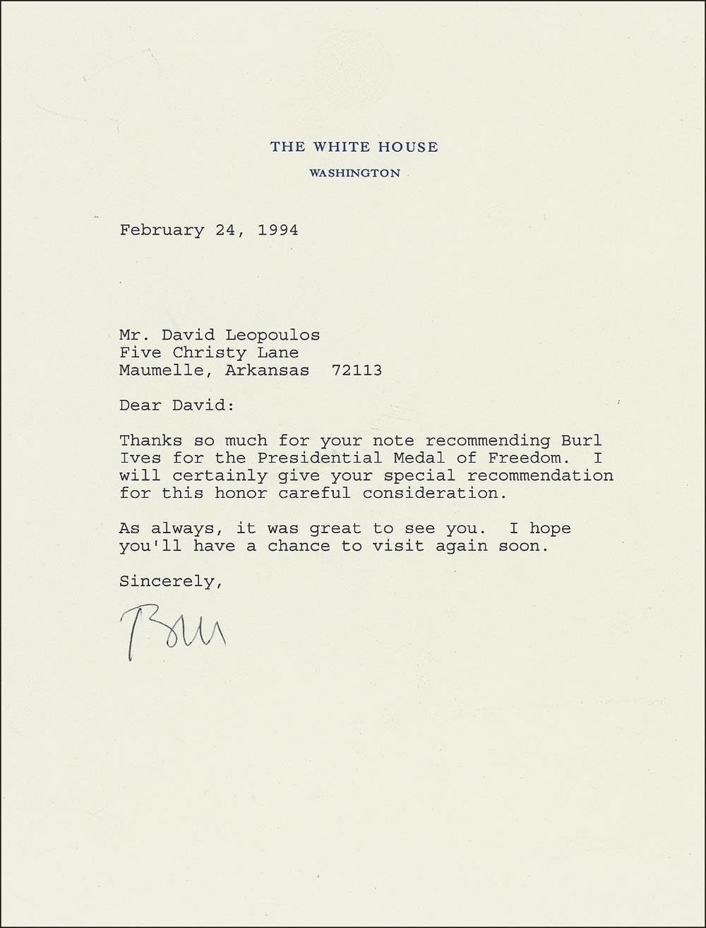 TLS as president signed “Bill,” one page, 6.75 x 8.75, White House letterhead, February 24, 1994. Clinton writes to David Leopoulos in Maumelle, Arkansas. In part: “Thanks so much for your note recommending Burl Ives for the Presidential Medal of Freedom. I will certainly give your special recommendation for this honor careful consideration….” In very fine condition. Pre-certified PSA/DNA and RRAuction COA.